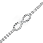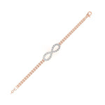 This bracelet features an elegant infinity symbol as the centerpiece, encrusted with shimmering diamonds. The band is a dual-chain design in rose gold, enhancing its sophistication and contemporary appeal. The infinity motif symbolizes eternal love or boundless possibilities, making it a meaningful gift or a stylish personal accessory.
