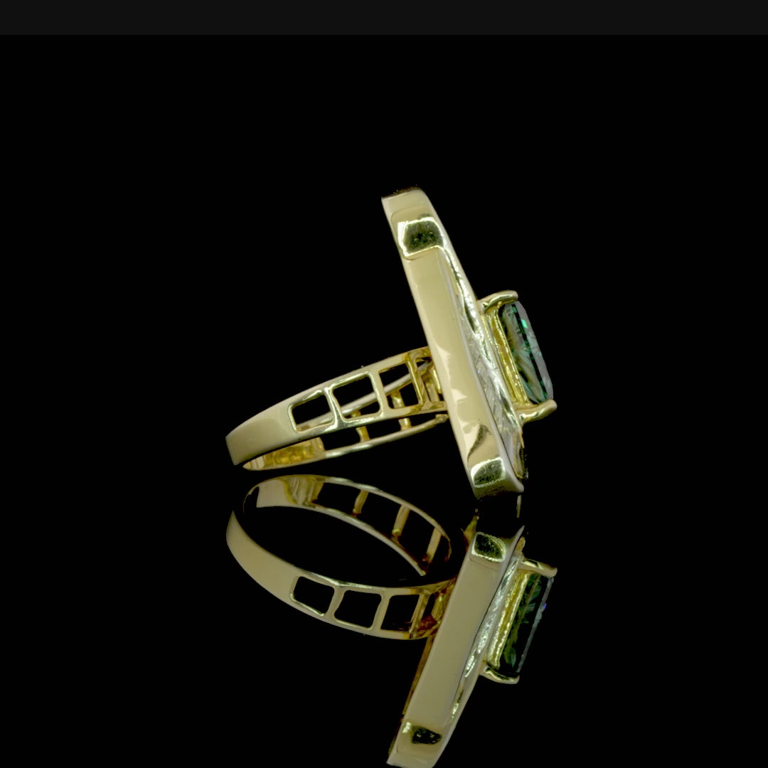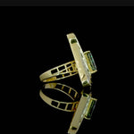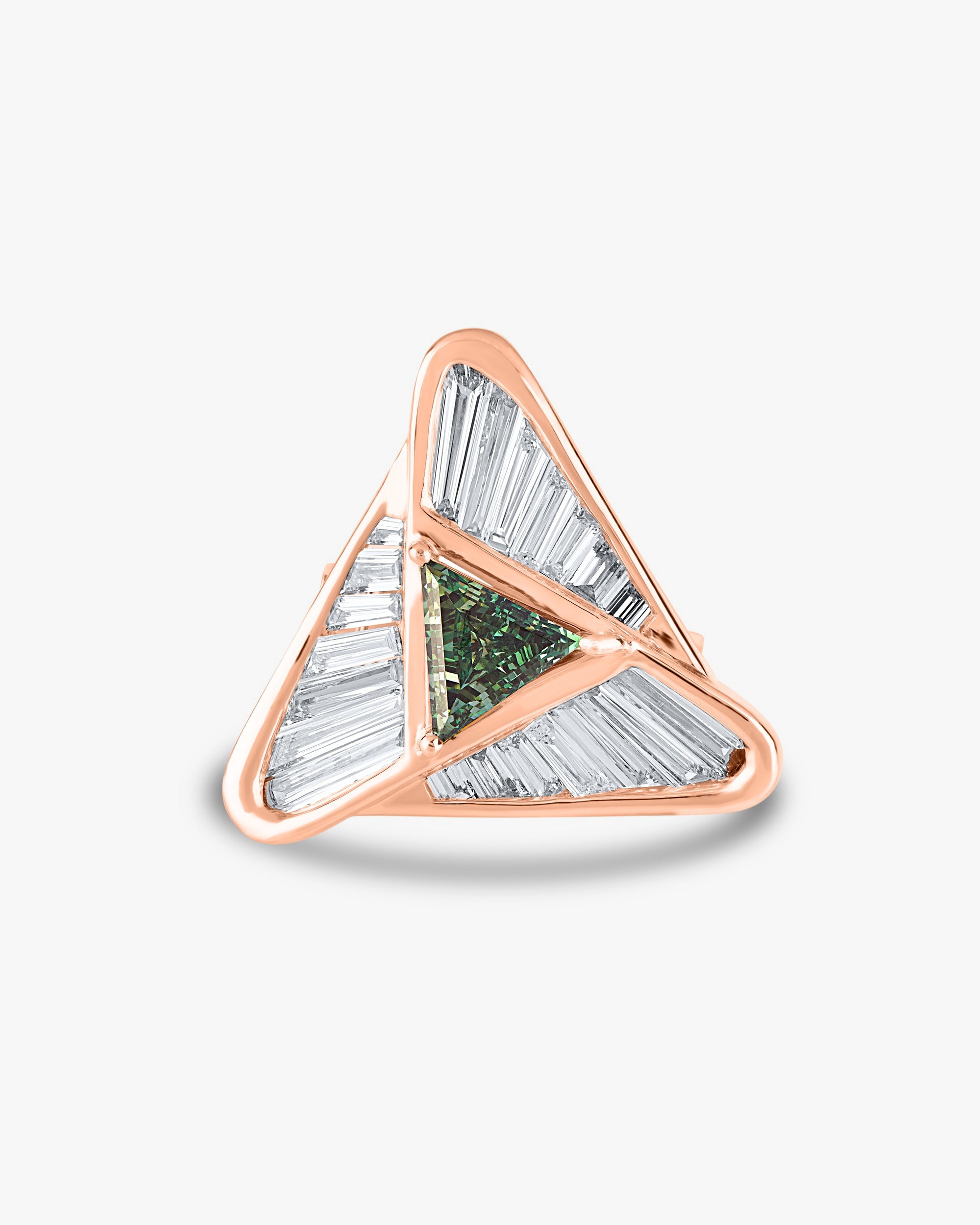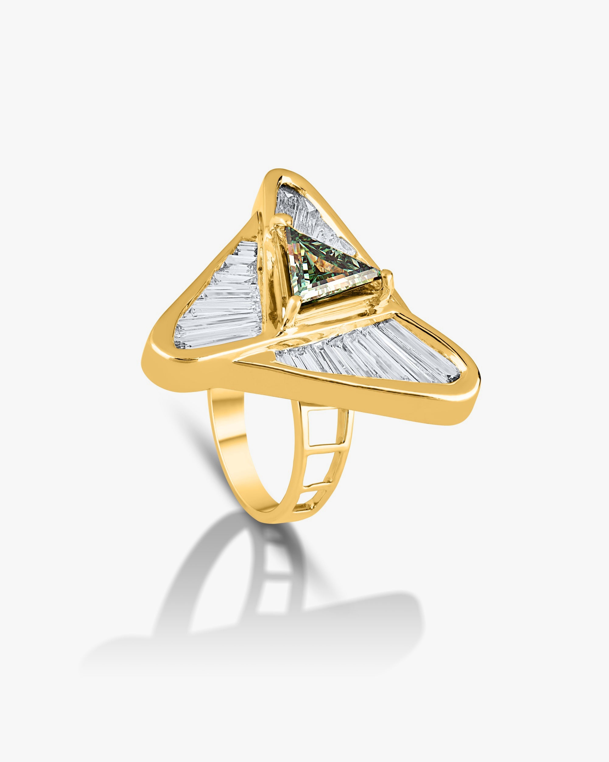 A bold fusion of geometry and luxury, this striking ring showcases a triangular design featuring a vivid green triangle-cut gemstone at its center, framed by an array of tapered baguette-cut diamonds. The precision-set diamonds radiate from the center in a dynamic pattern, all encased in a polished yellow gold setting that enhances the ring’s modern aesthetic. Perfect for those with an eye for avant-garde elegance, this piece is a true statement of individuality and style.