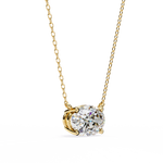 This is an elegant oval-cut diamond solitaire pendant, set in a four-prong yellow gold setting. The diamond is suspended horizontally between a delicate gold chain, allowing the stone to be the centerpiece of the necklace. The design is minimal and timeless, making it perfect for both everyday wear and formal occasions. The yellow gold adds a classic touch, enhancing the brilliance of the diamond.