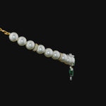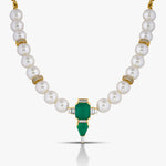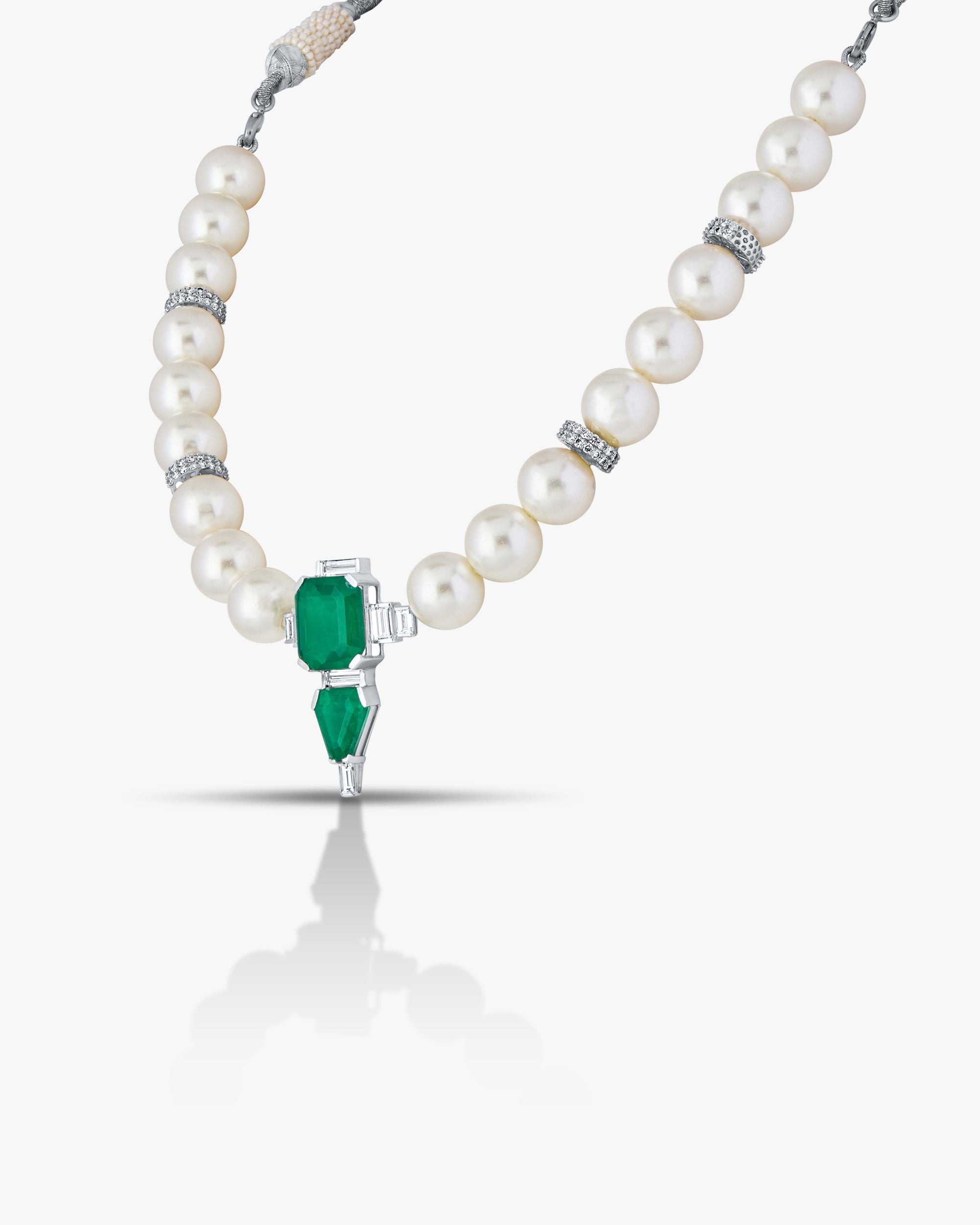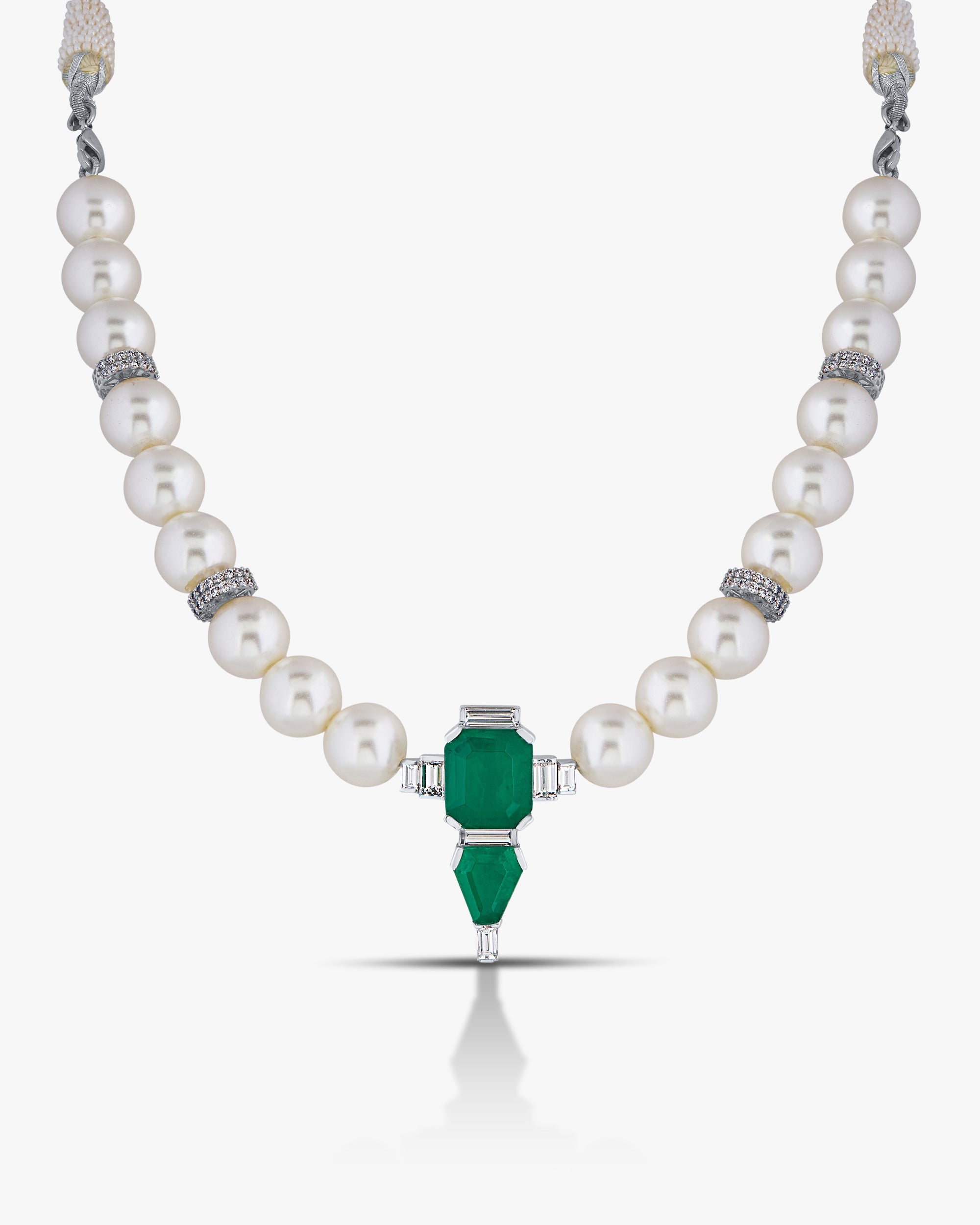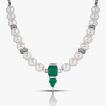 This image shows a sophisticated choker style necklace featuring large, lustrous white pearls strung together. At the center of the necklace is a striking statement piece composed of two prominent green gemstones likely emeralds set in a sleek white metal, possibly platinum or white gold.