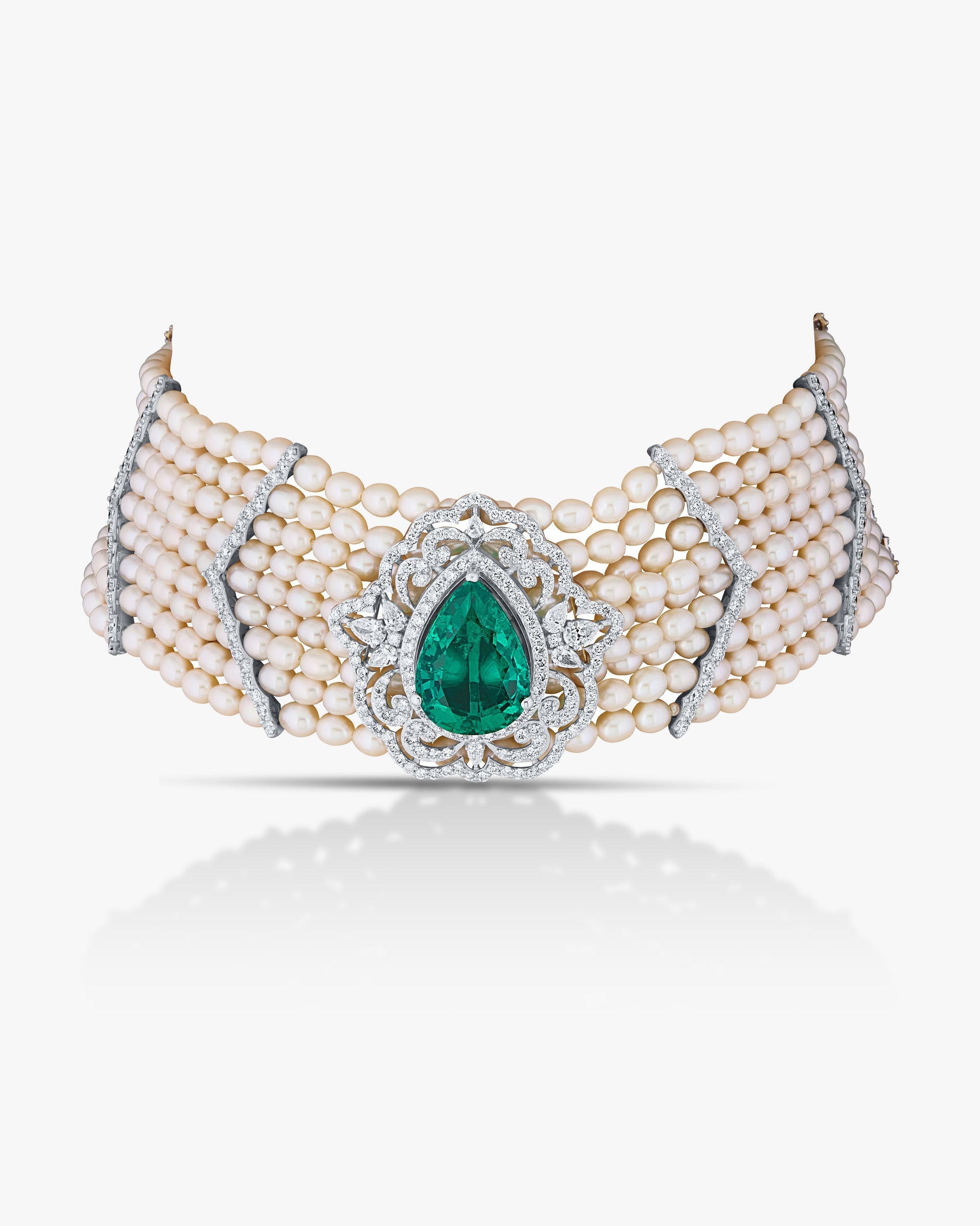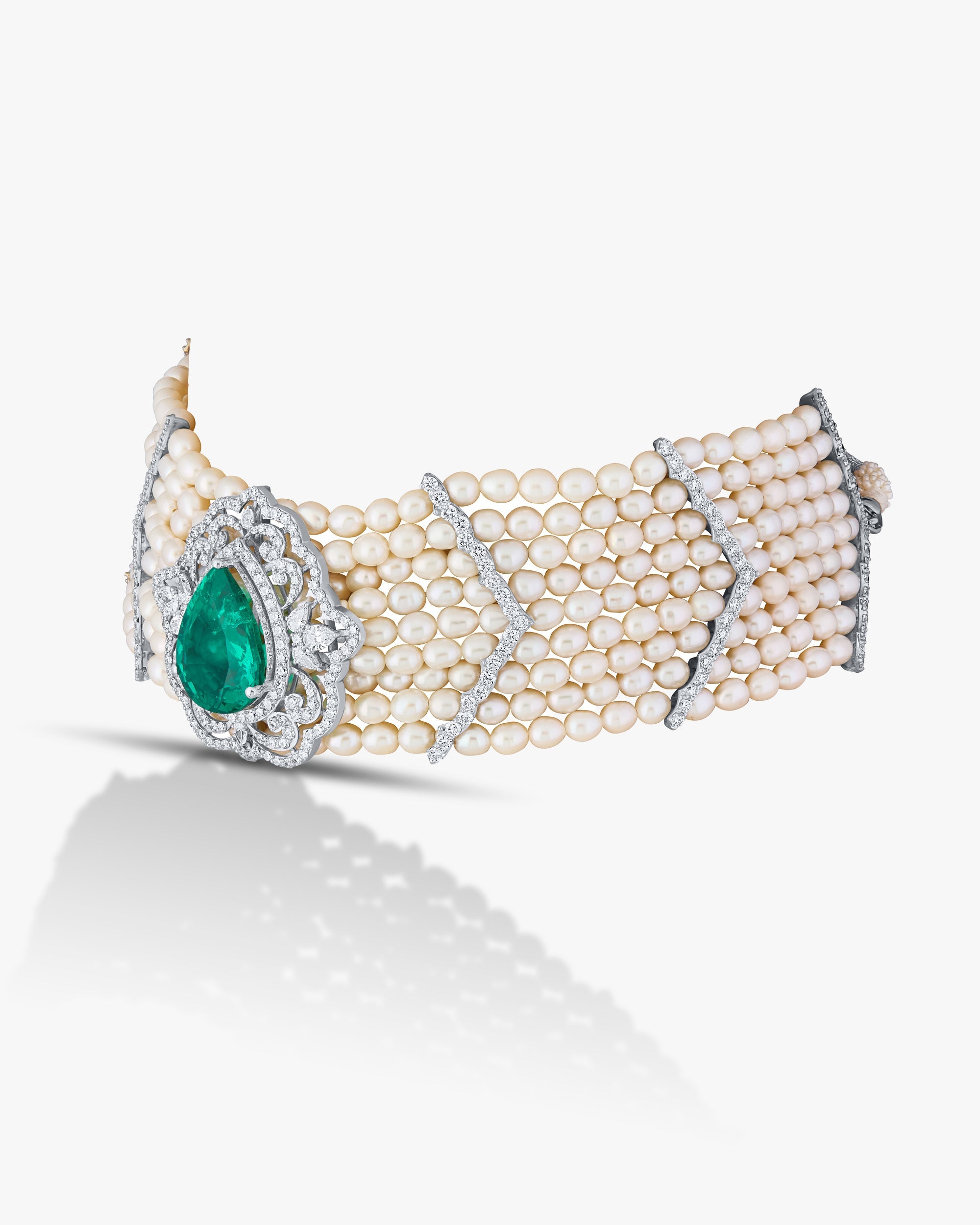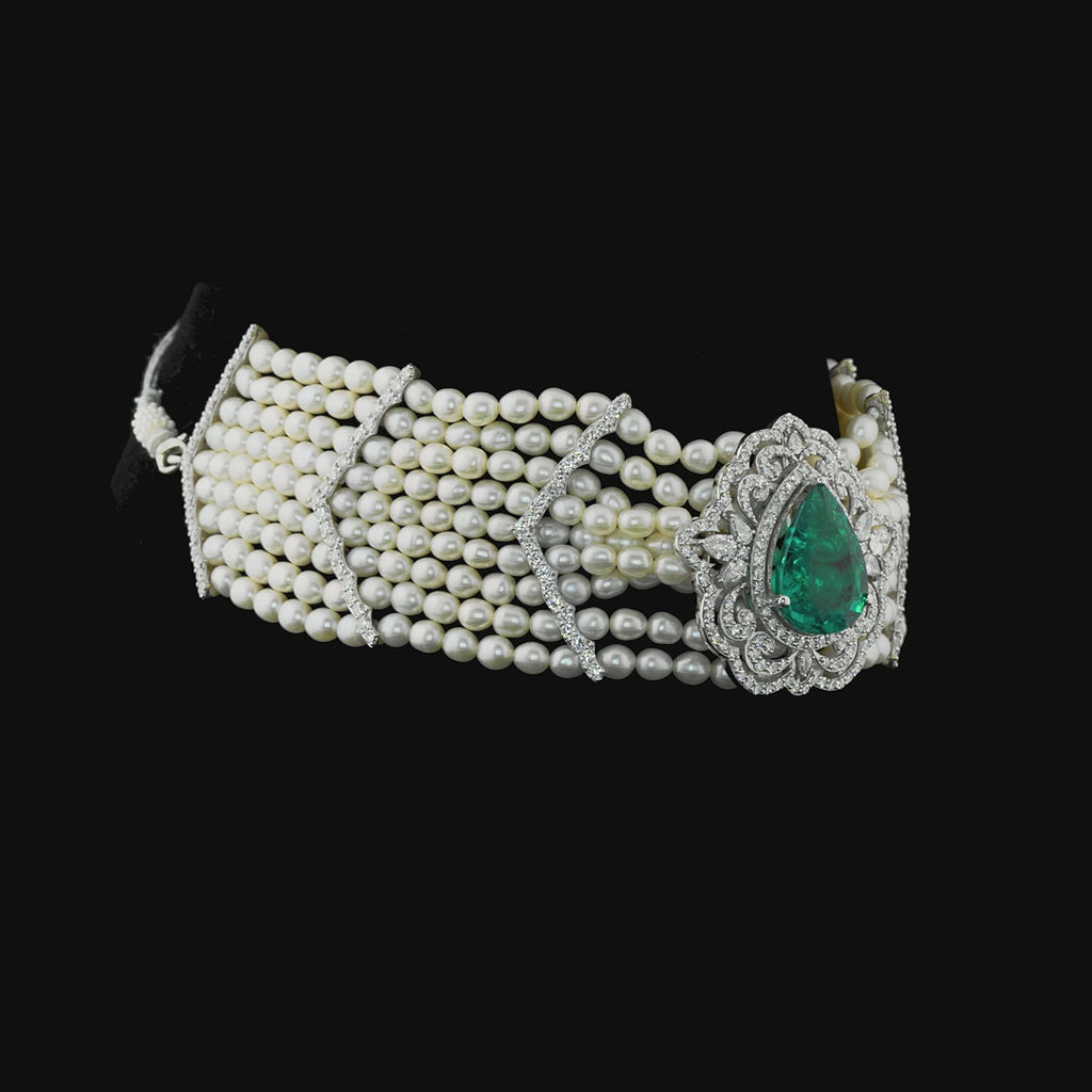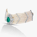 This luxurious bracelet is a stunning blend of traditional elegance and fine craftsmanship. The band features multiple rows of creamy white pearls, arranged in parallel strands that create a wide and regal cuff. Accentuating the pearls are delicate chevron-shaped dividers crafted with shimmering diamonds, adding a structured and sophisticated pattern to the design.