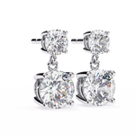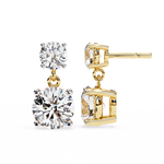 These stunning gold earrings feature a classic two-stone drop design that blends elegance with brilliance. Each earring showcases a smaller round-cut gemstone at the top, connected by a delicate gold link to a larger round-cut stone below.