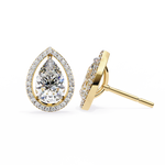 These stunning pear-shaped stud earrings exude timeless elegance. Crafted in luxurious yellow gold, each earring features a brilliant central teardrop-cut stone encircled by a halo of dazzling smaller diamonds, creating a radiant sparkle from every angle.