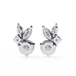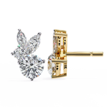 This features a stunning pair of stud earrings with a modern yet elegant design. Each earring showcases a large round brilliant-cut gemstone as the focal point, radiating brilliance and clarity. Above it, two marquise-cut diamonds are arranged in a delicate leaf-like pattern, adding a graceful, nature-inspired touch.