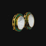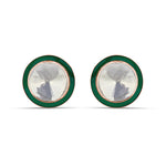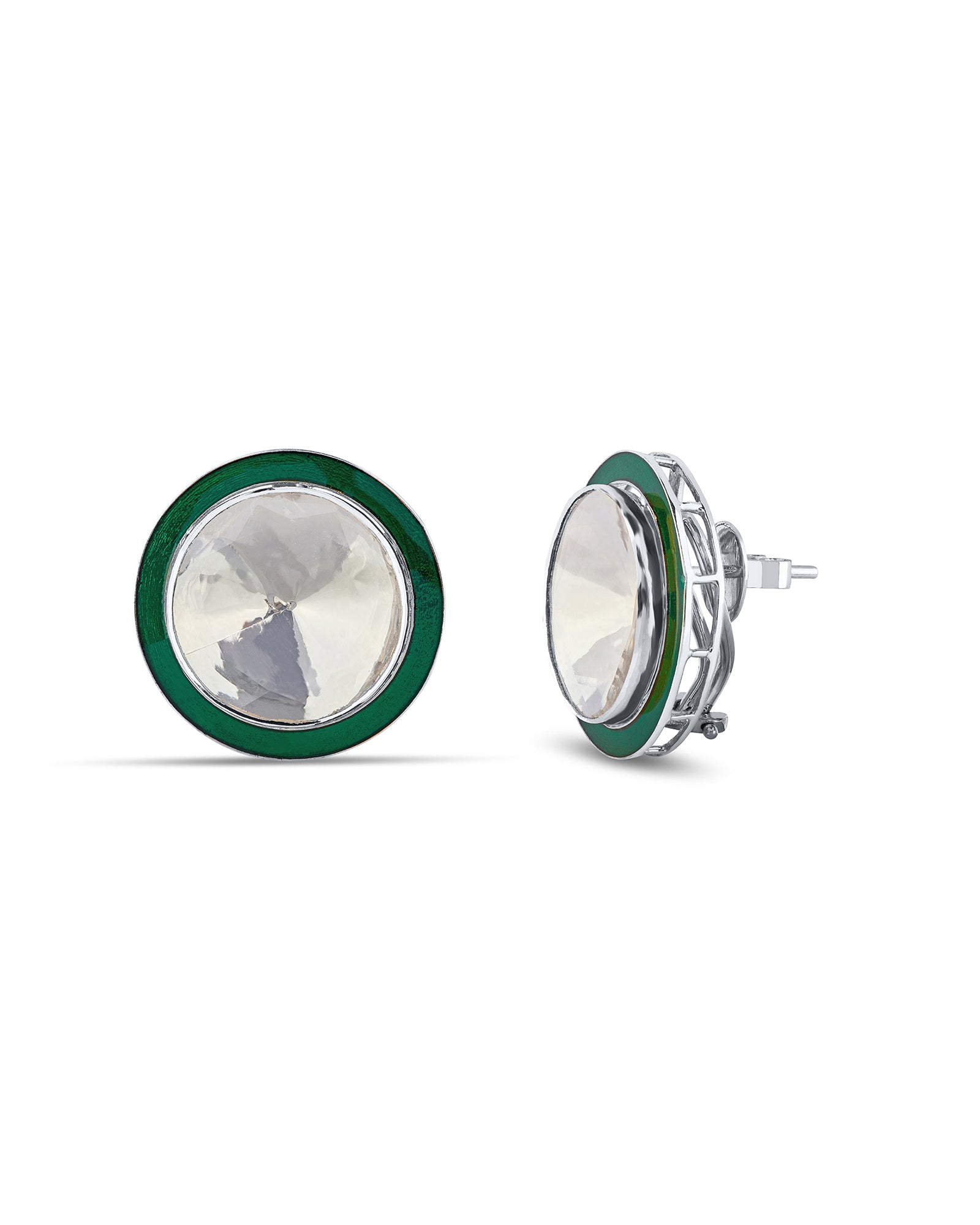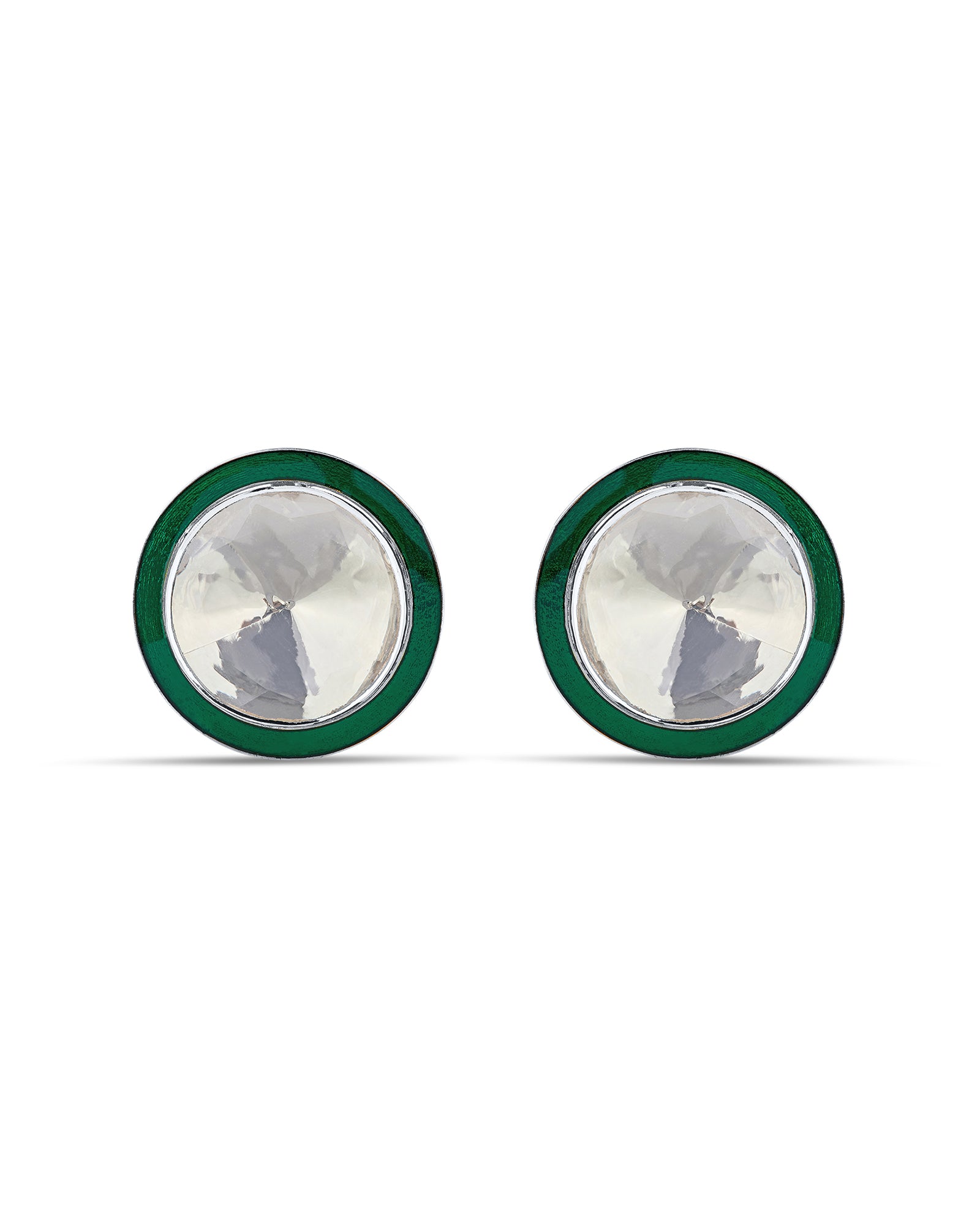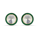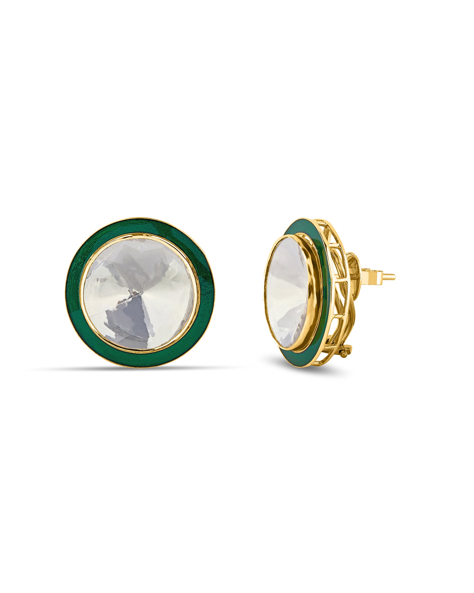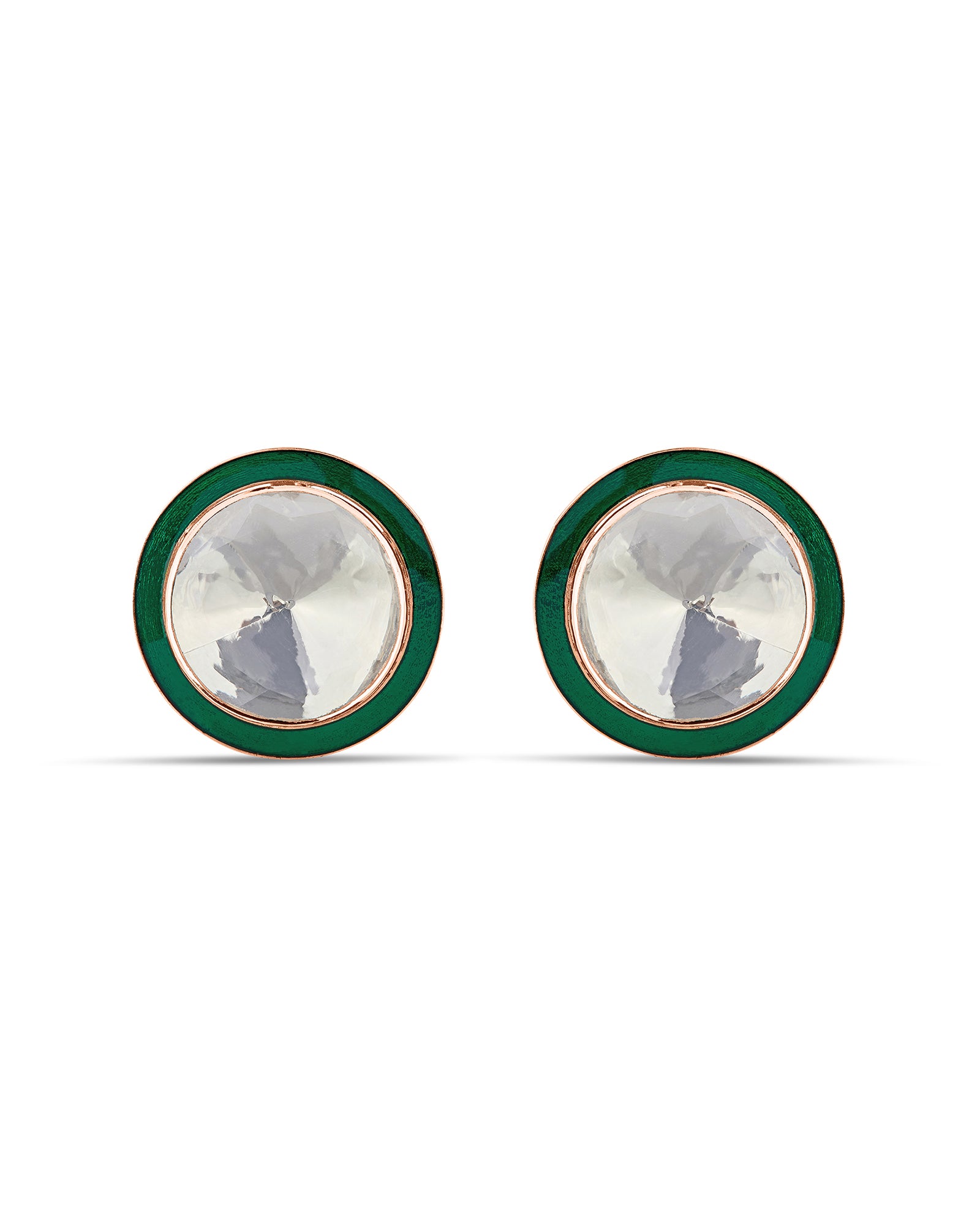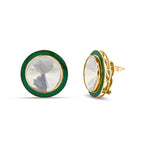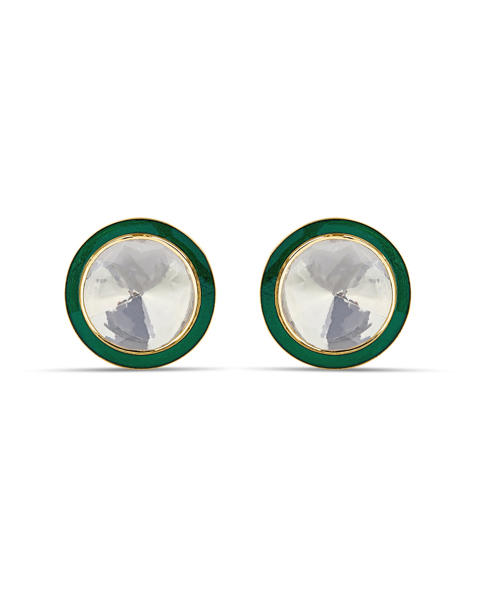 A radiant circular crystal with a soft petal-cut finish sits at the center, framed by a striking emerald green enamel ring. Set in a fine gold border, these EmeraldAura Studs blend natural clarity with vibrant color perfect for a look that’s both fresh and timeless, echoing nature and royalty in one design.