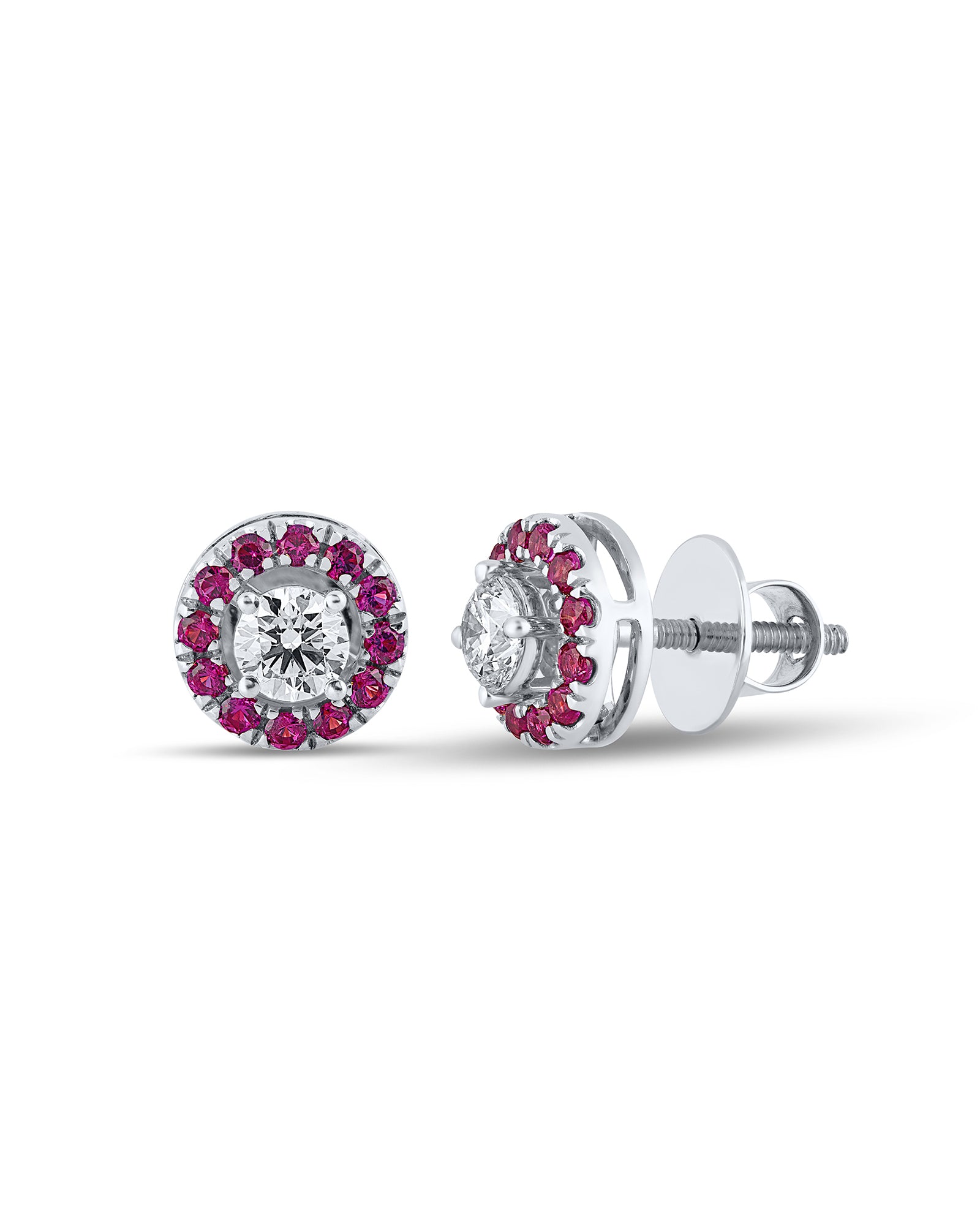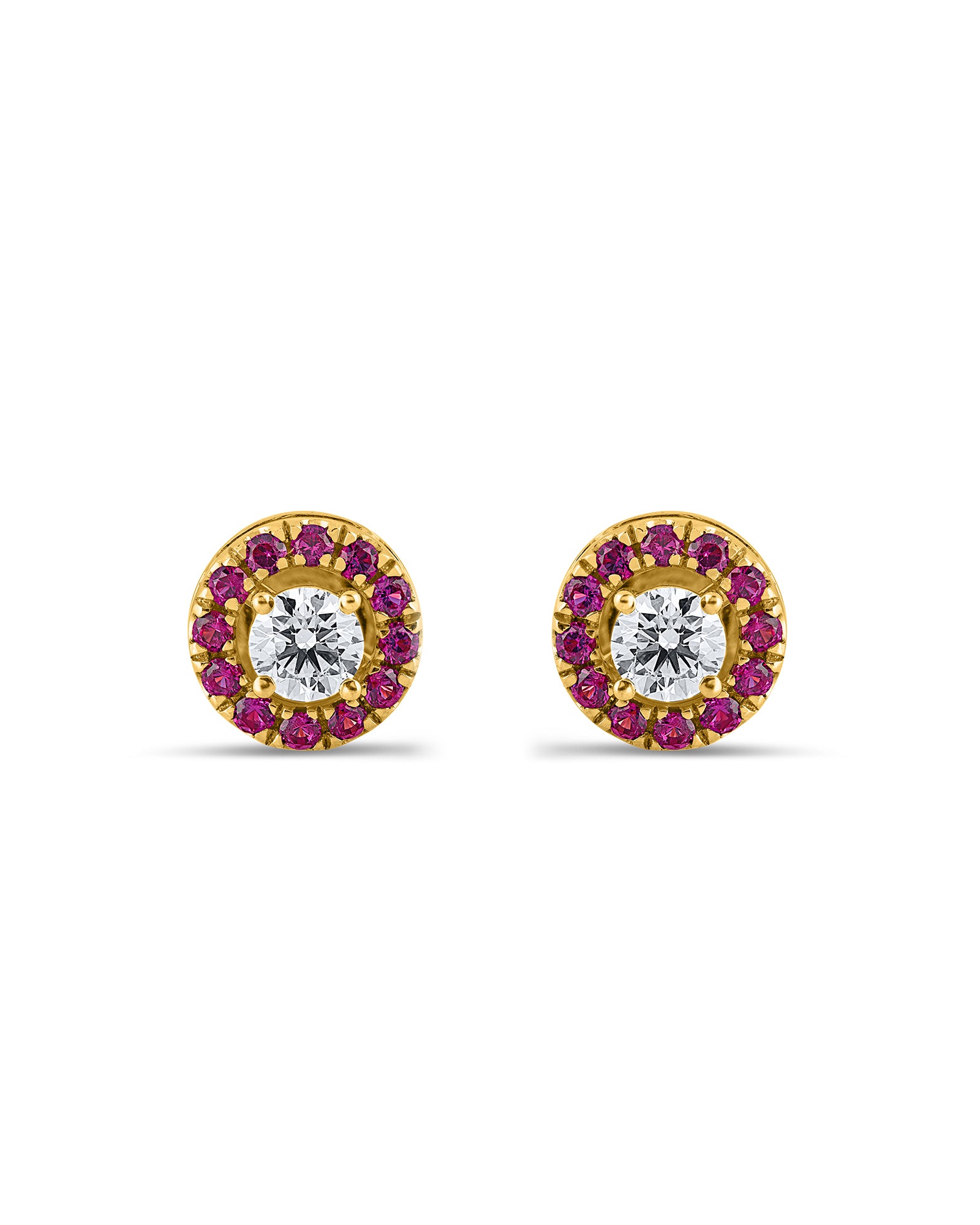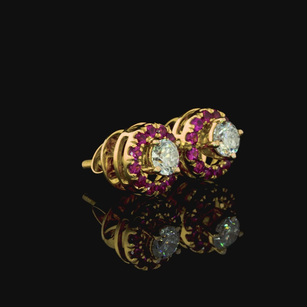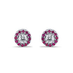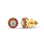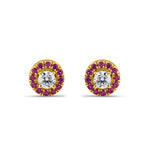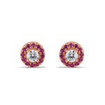Eye-catching oval studs featuring a brilliant central white stone surrounded by a vivid halo of pink ruby-like gems. Set in gold, these earrings offer a perfect blend of sparkle and color for festive or elegant wear.