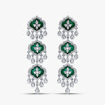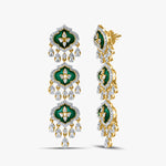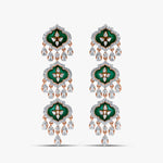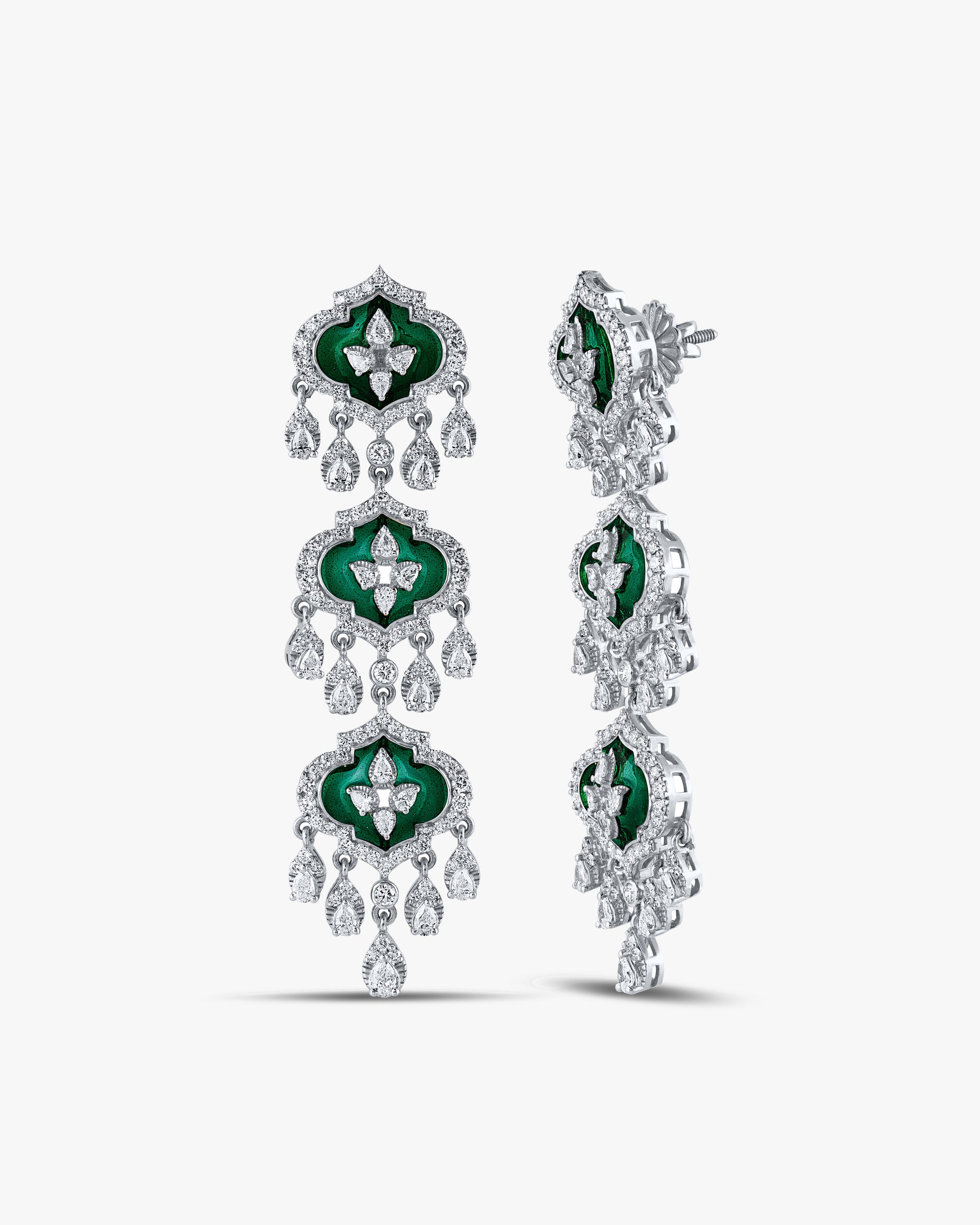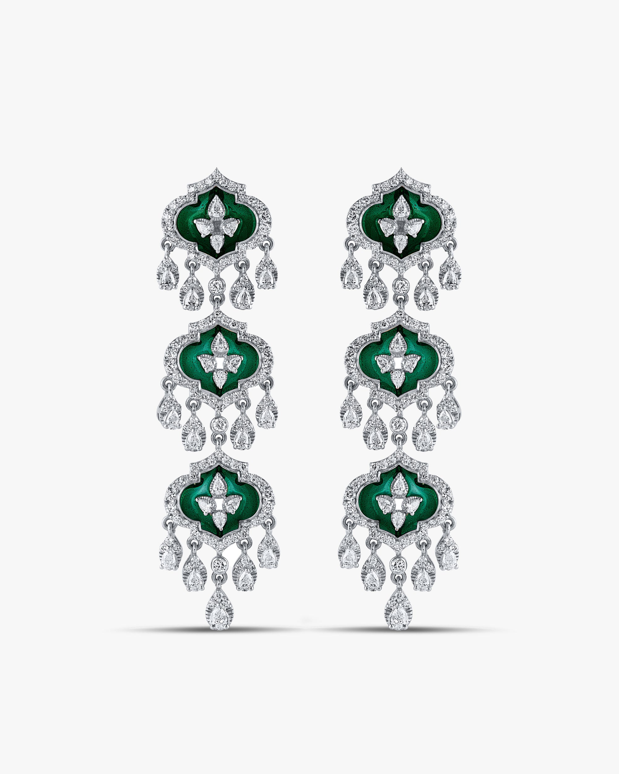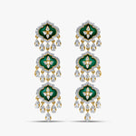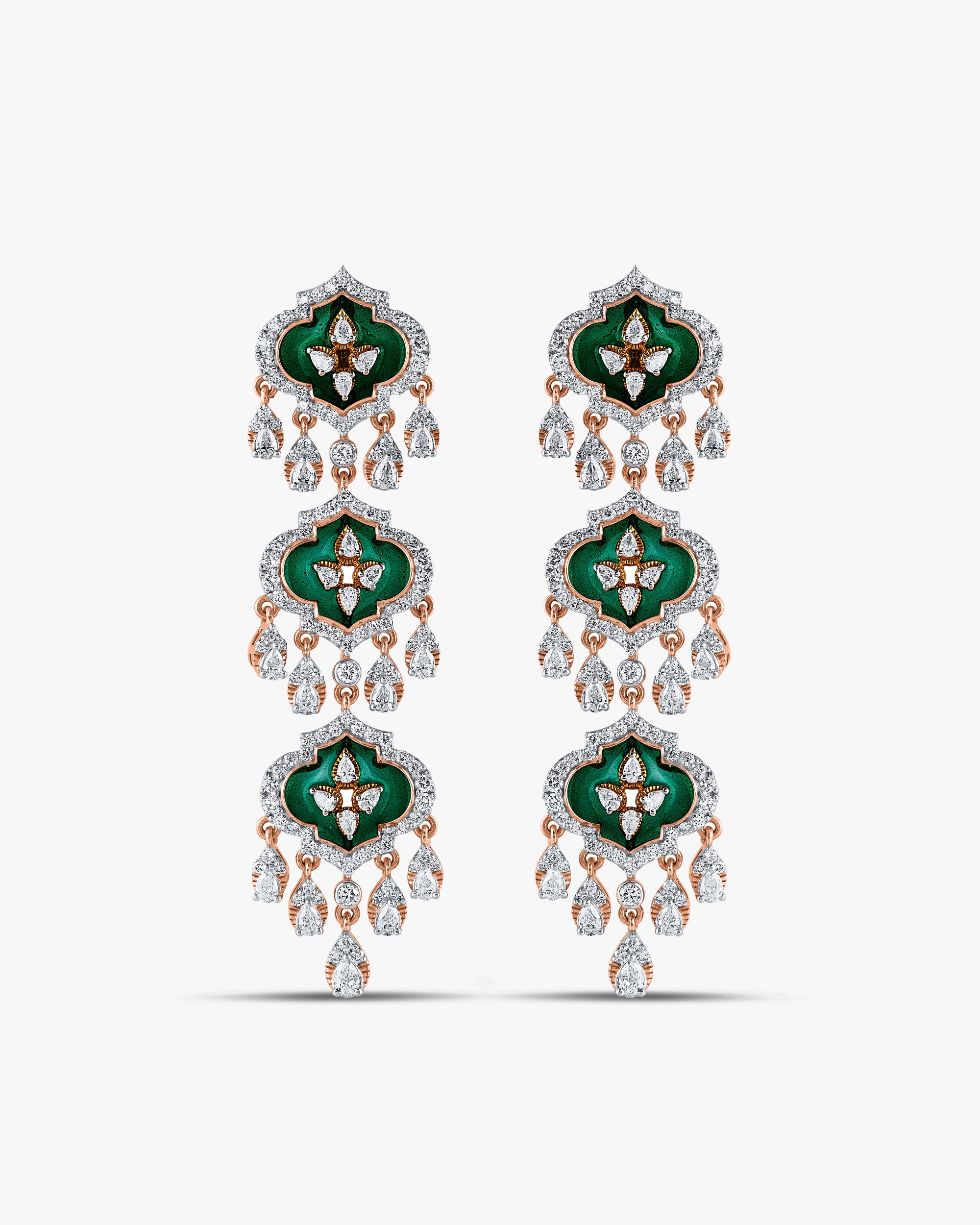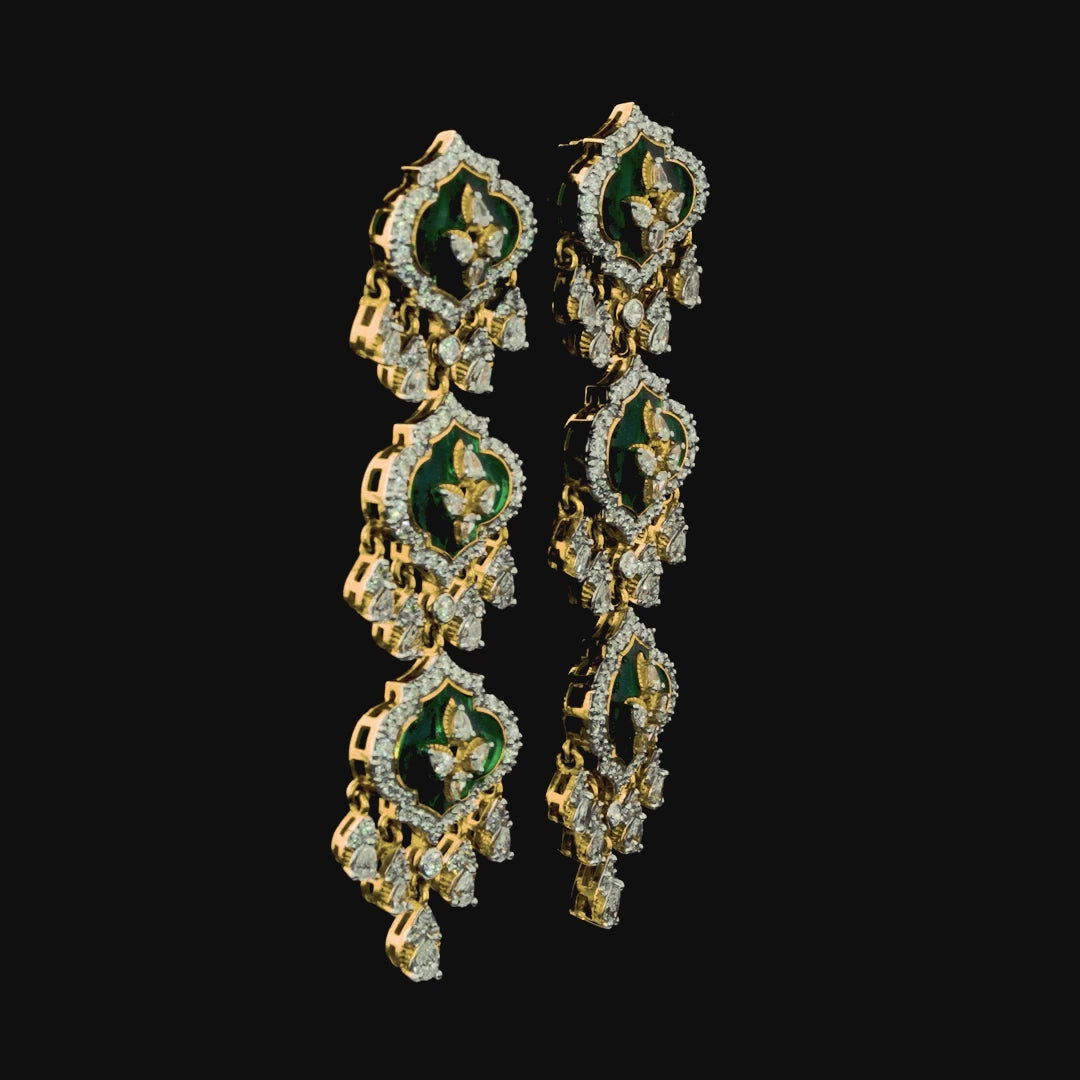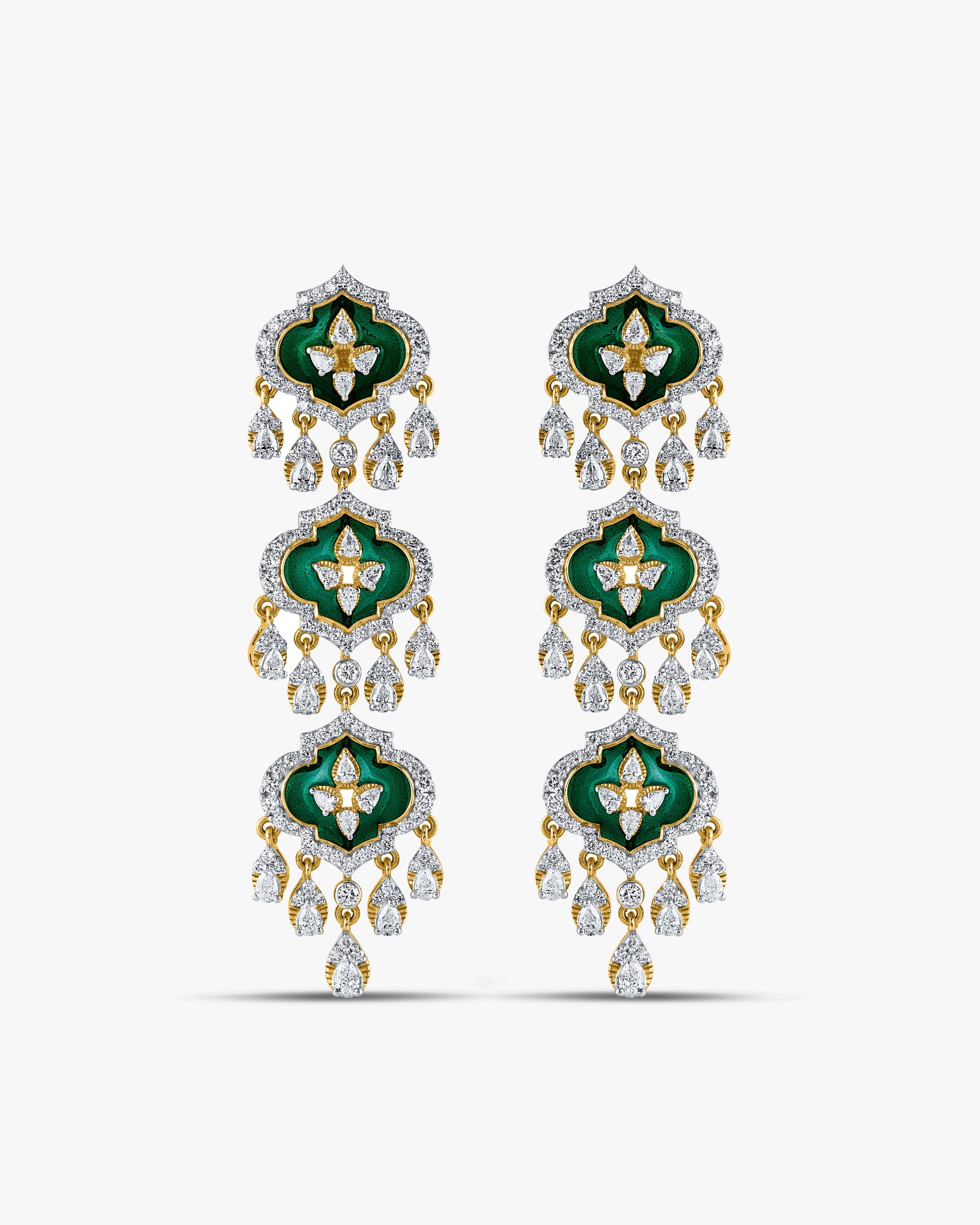 Three tier glass enamel earrings are earrings that consist of three layers or tiers of enamel elements. Glass enamel is a traditional indian artform used in old jewellery worn by maharanis for an elevated and colourful look. They can be a stylish and eye-catching accessory to complement various outfits and styles! 💫✨