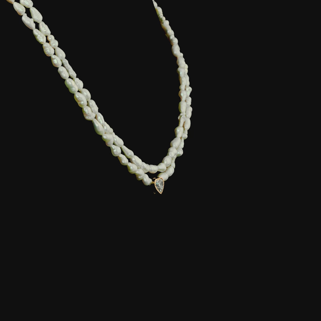 This romantic necklace features a string of delicate white pearls, gracefully accented by a heart-shaped pendant. The centerpiece sparkles with a clear white stone set in a gold frame, adding a touch of timeless beauty and charm. Ideal for elegant evenings or heartfelt gifts.