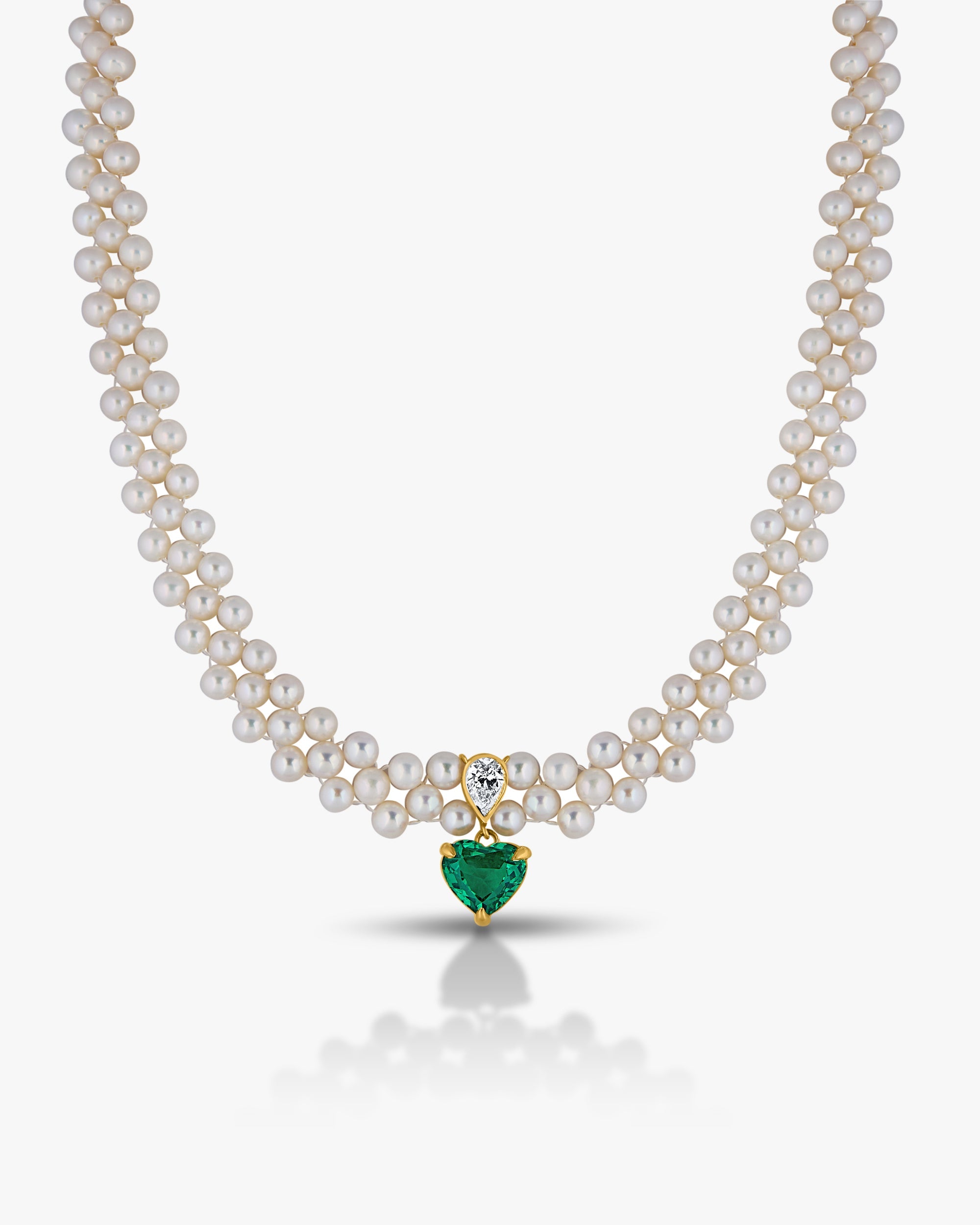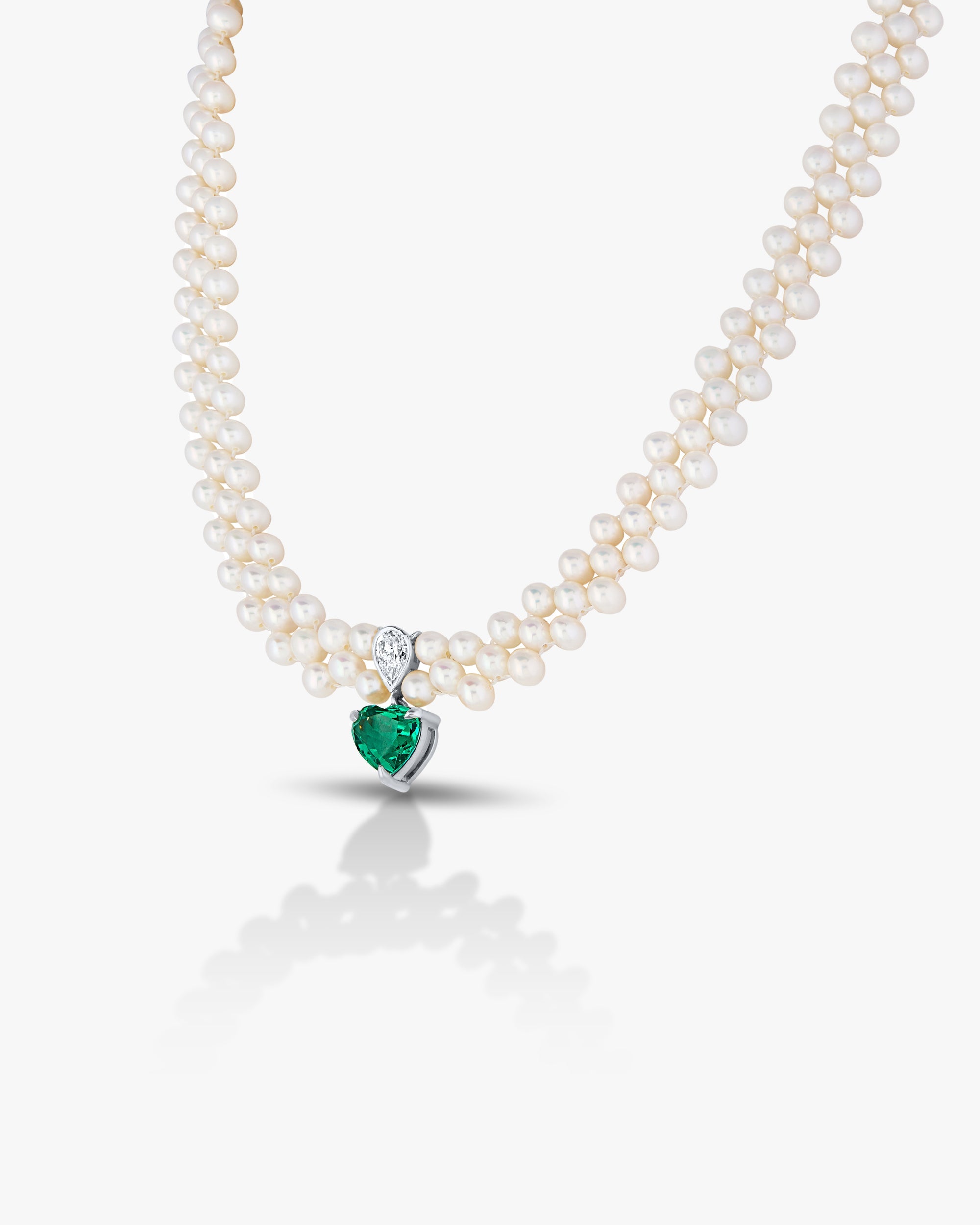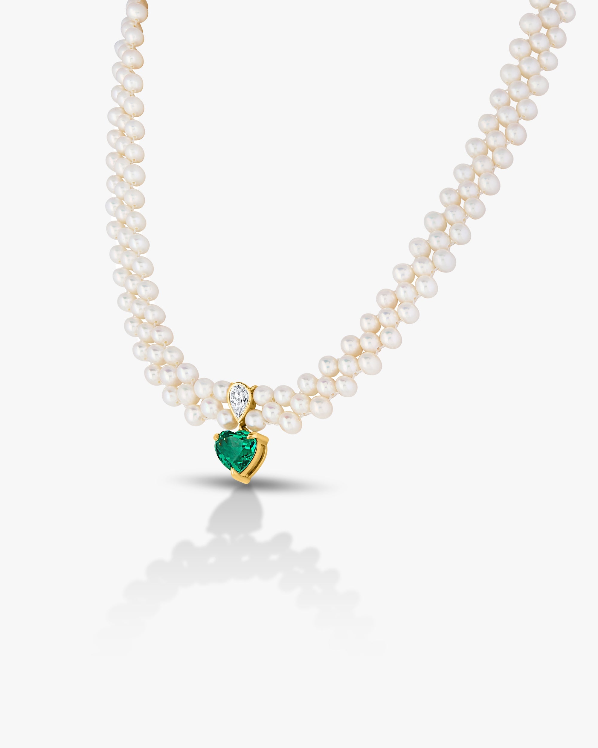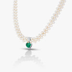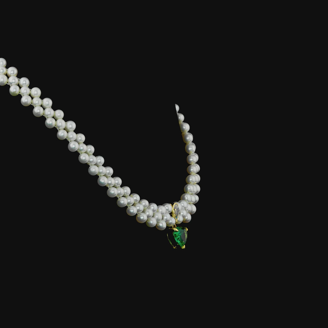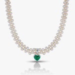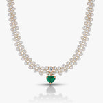 This elegant necklace features three rows of lustrous white pearls, beautifully arranged to create a classic and graceful look. At the center hangs a striking heart-shaped green stone set in a gold frame, adding a romantic and luxurious touch. Perfect for special occasions or timeless style.