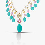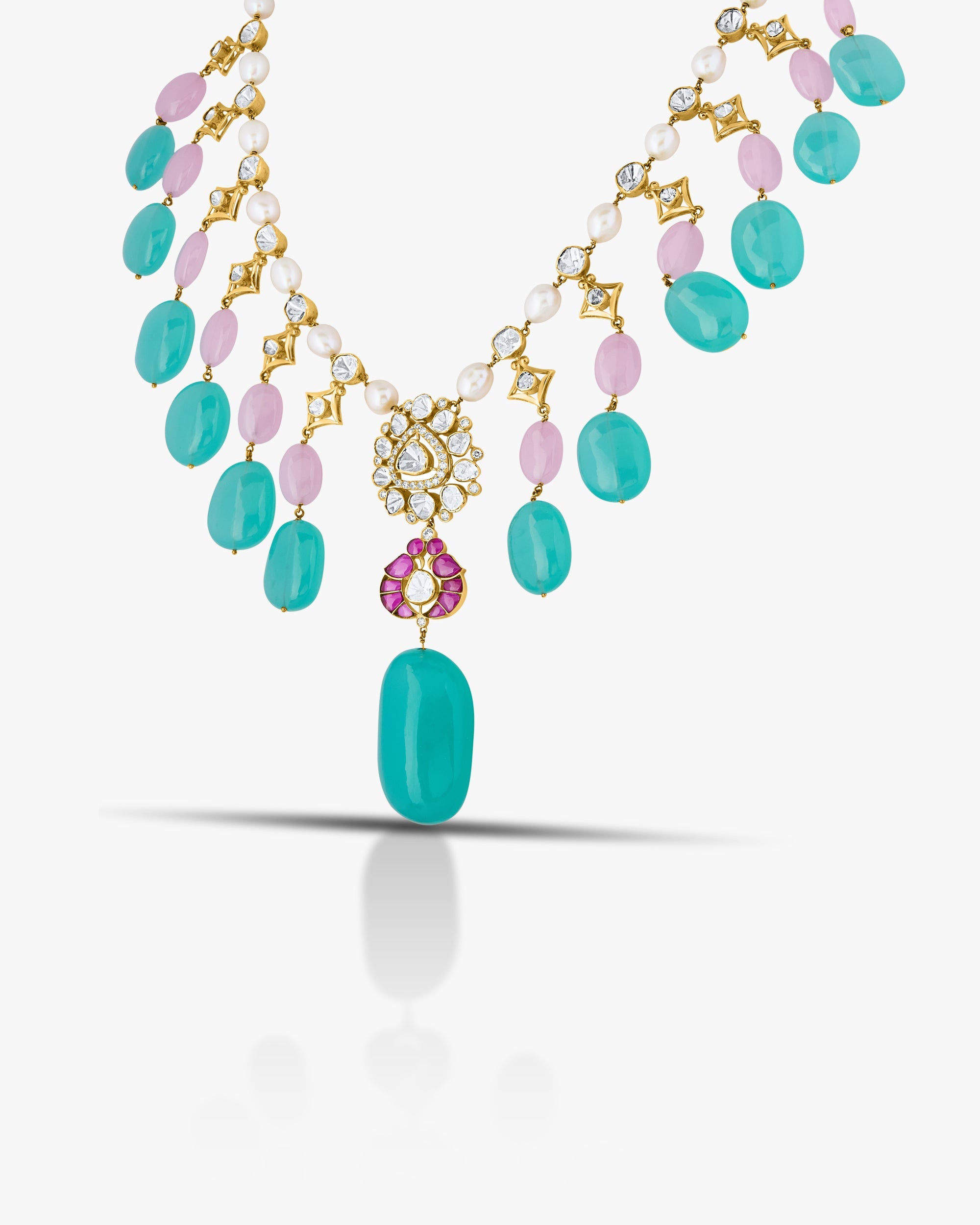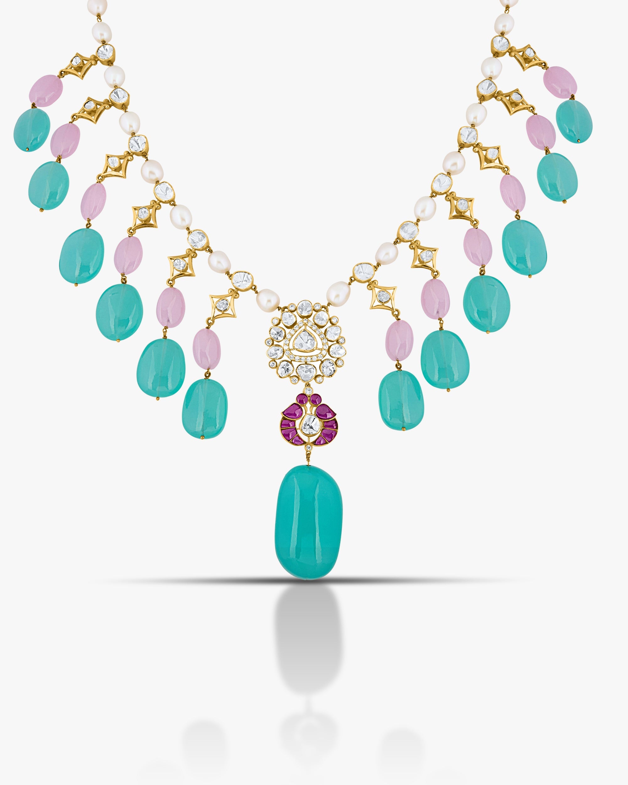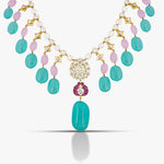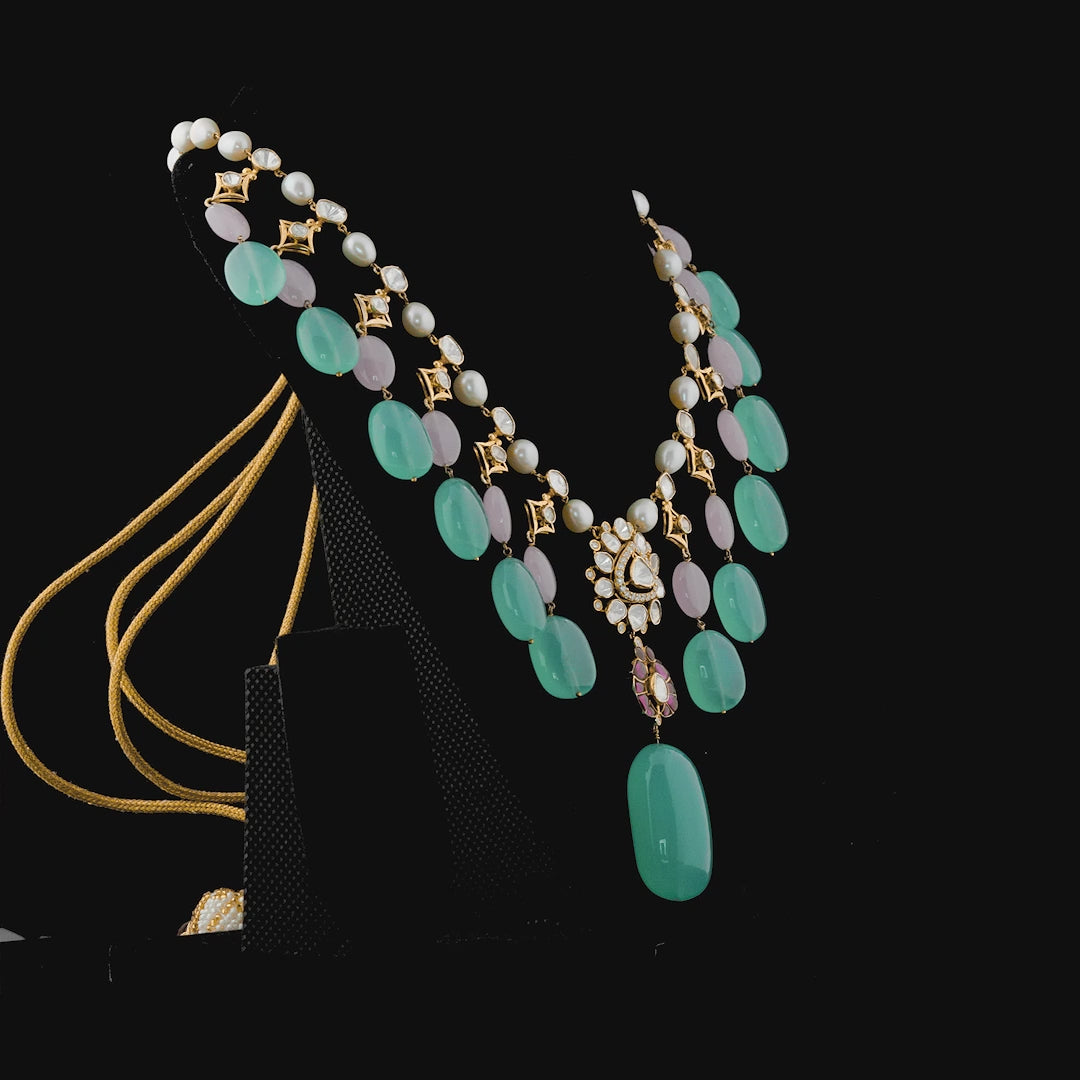 This striking necklace exemplifies traditional elegance with a vibrant and colorful design. It features a combination of soft pastel green and pink gemstone drops, elegantly interspersed with creamy white pearls. The upper portion of the necklace includes a symmetrical arrangement of these gems, connected by intricate gold links that add a regal charm.