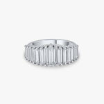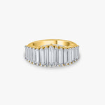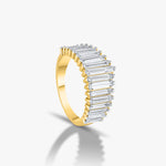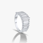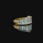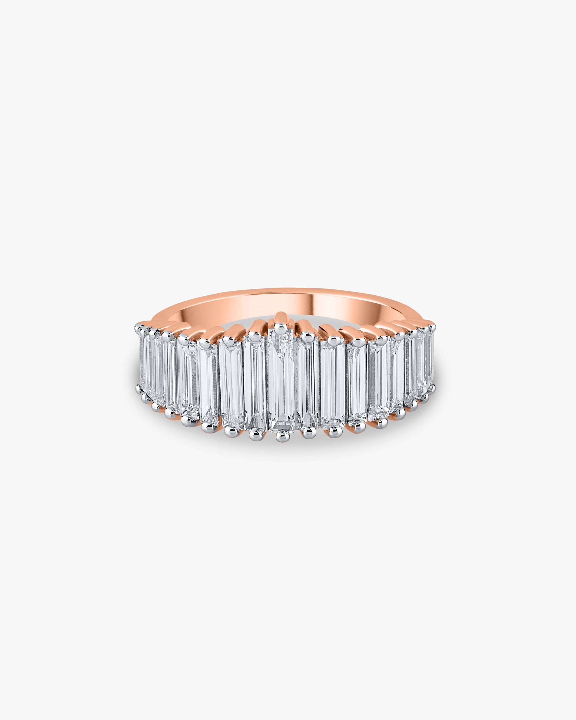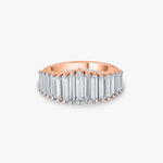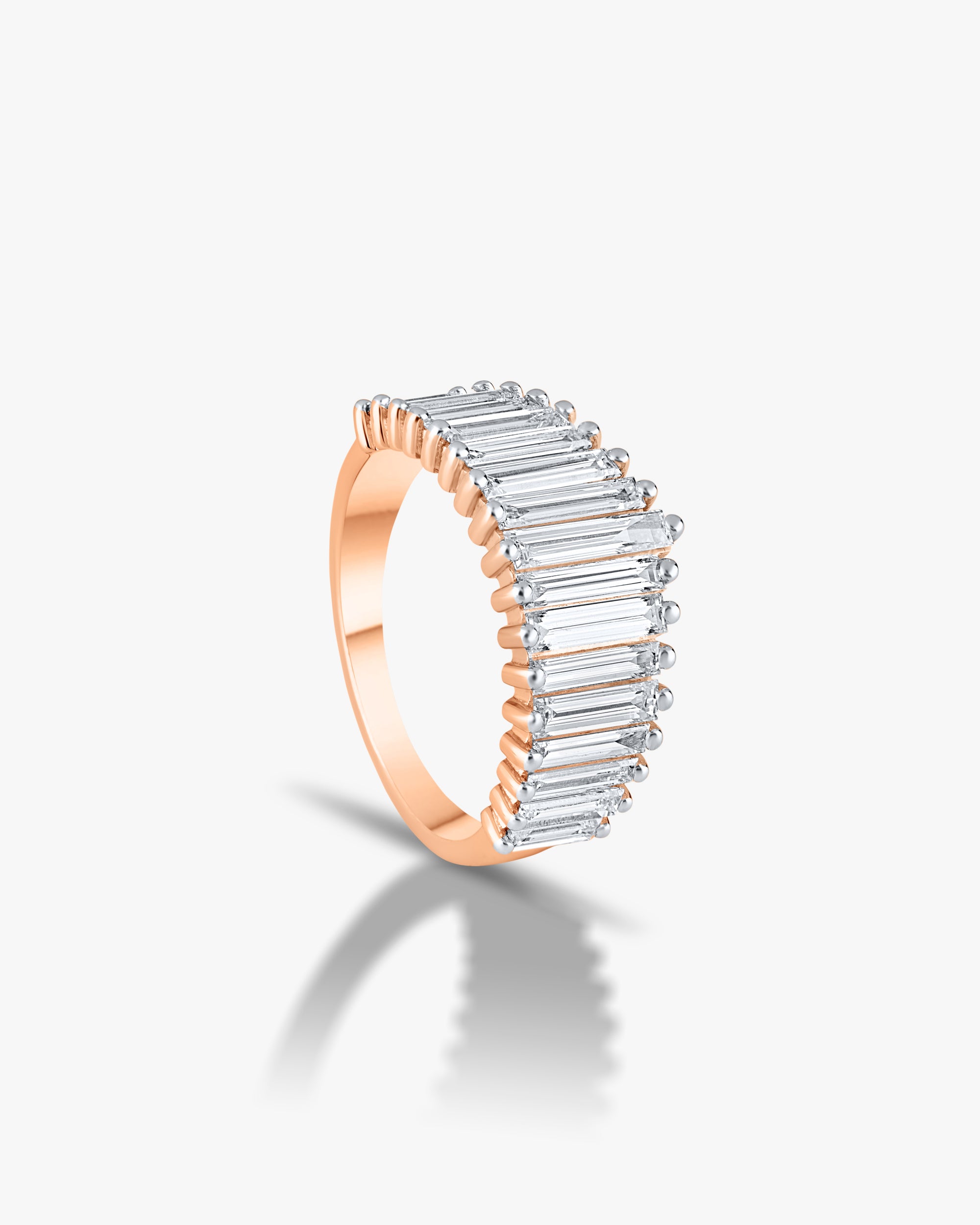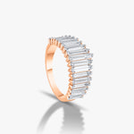 This distinctive ring features a striking and modern design, showcasing a row of vertically set baguette-cut stones arranged in a fan-like arc. The stones are mounted in white metal prongs, creating a radiant, structured appearance that adds depth and brilliance. The band itself is crafted from rose gold, providing a warm contrast to the cool-toned stones and setting. The combination of rose gold and sleek, linear stones gives this piece a contemporary elegance, making it a standout accessory ideal for both formal and fashionable everyday wear.