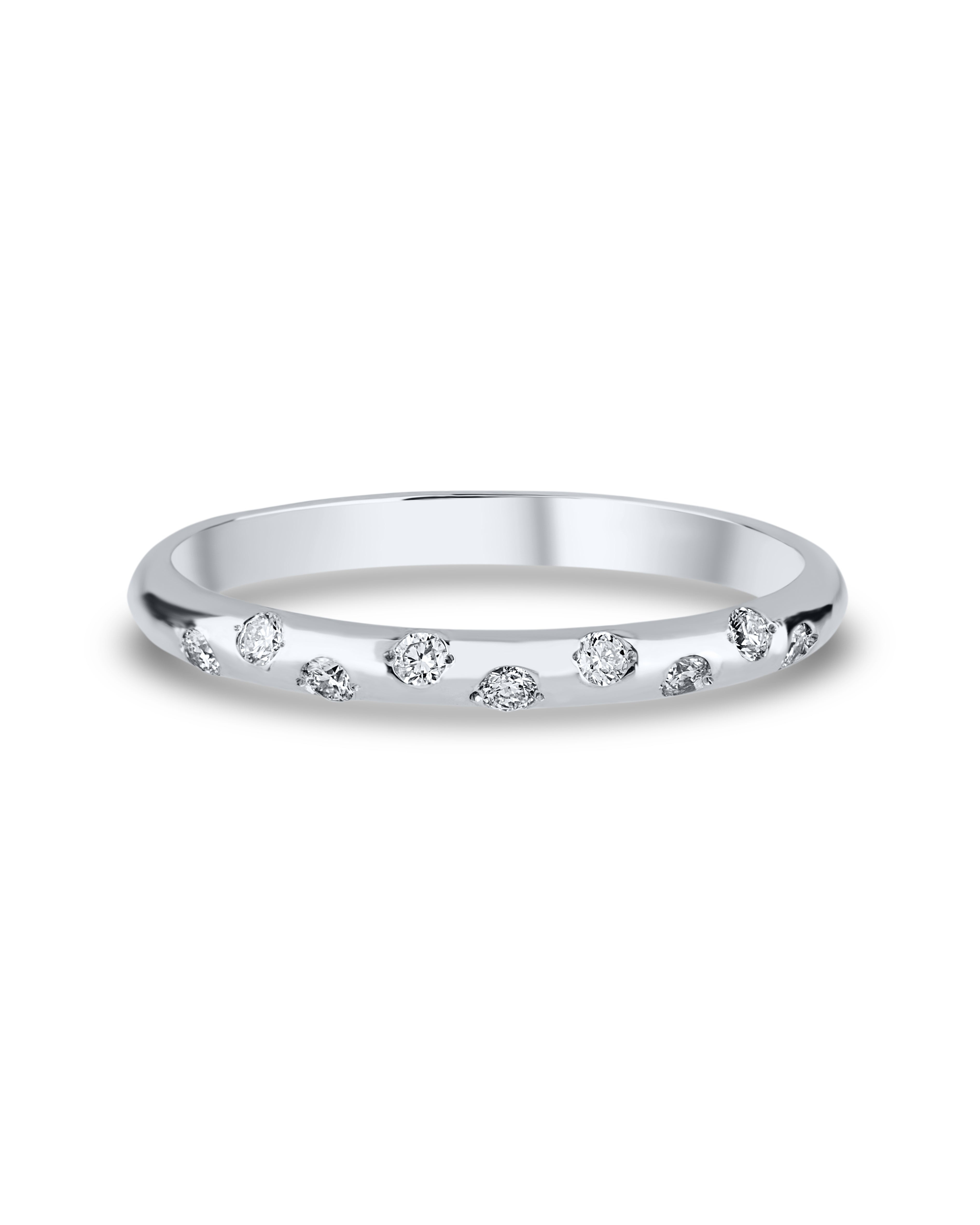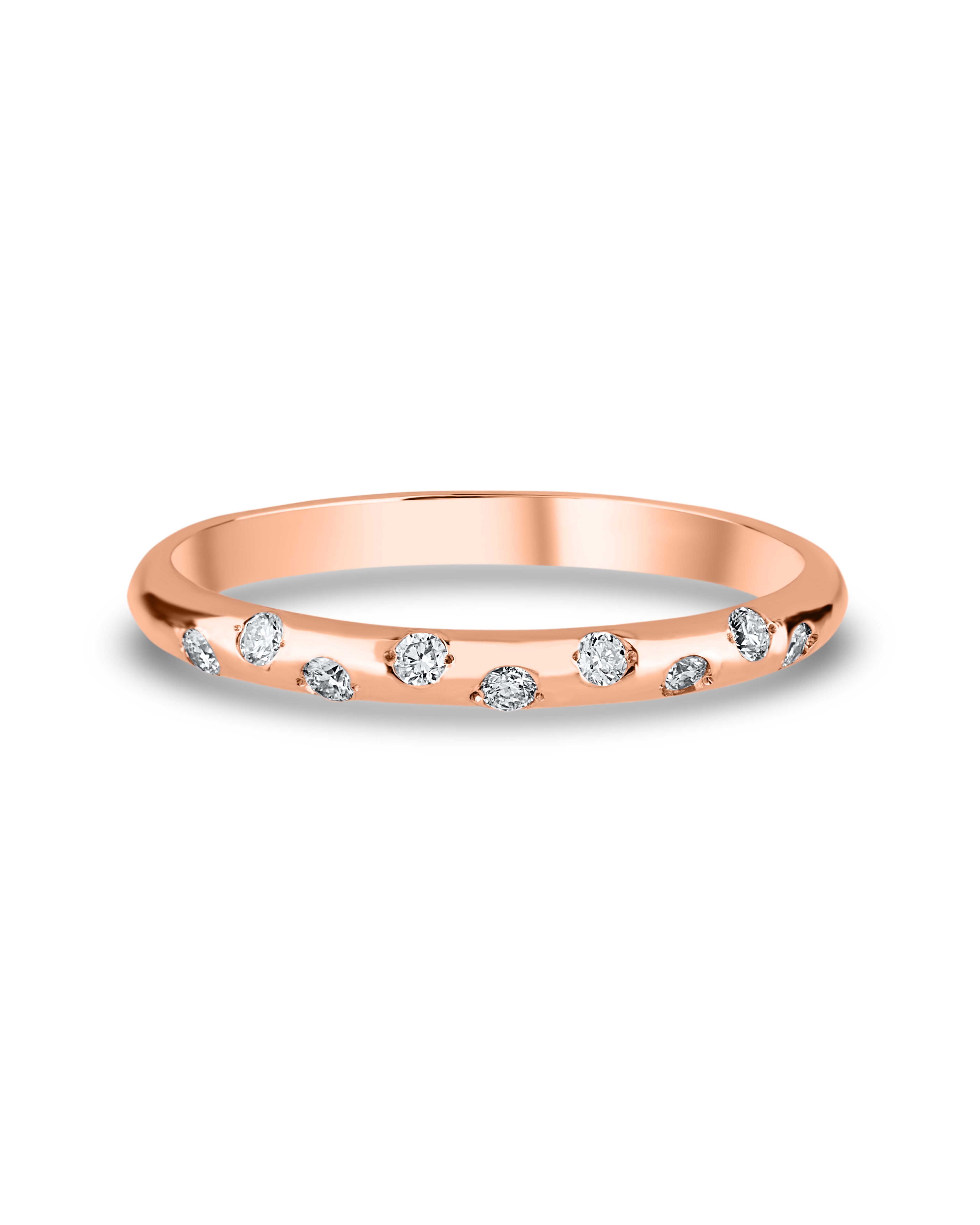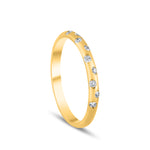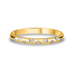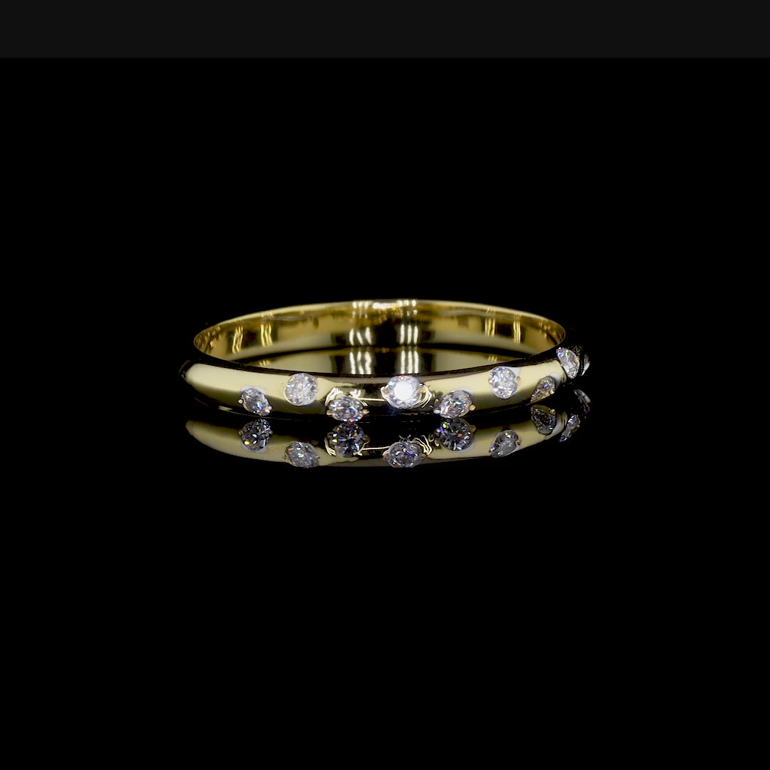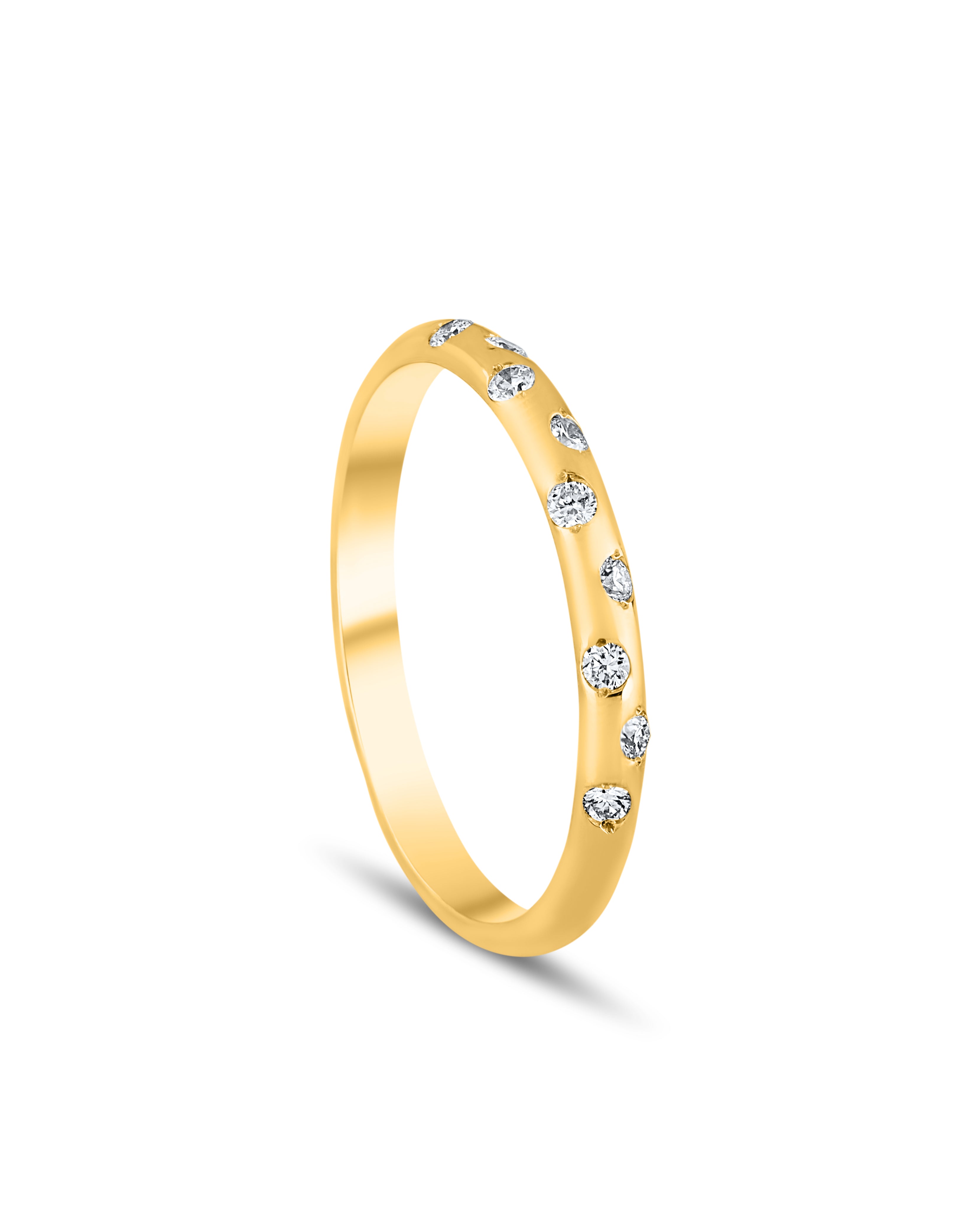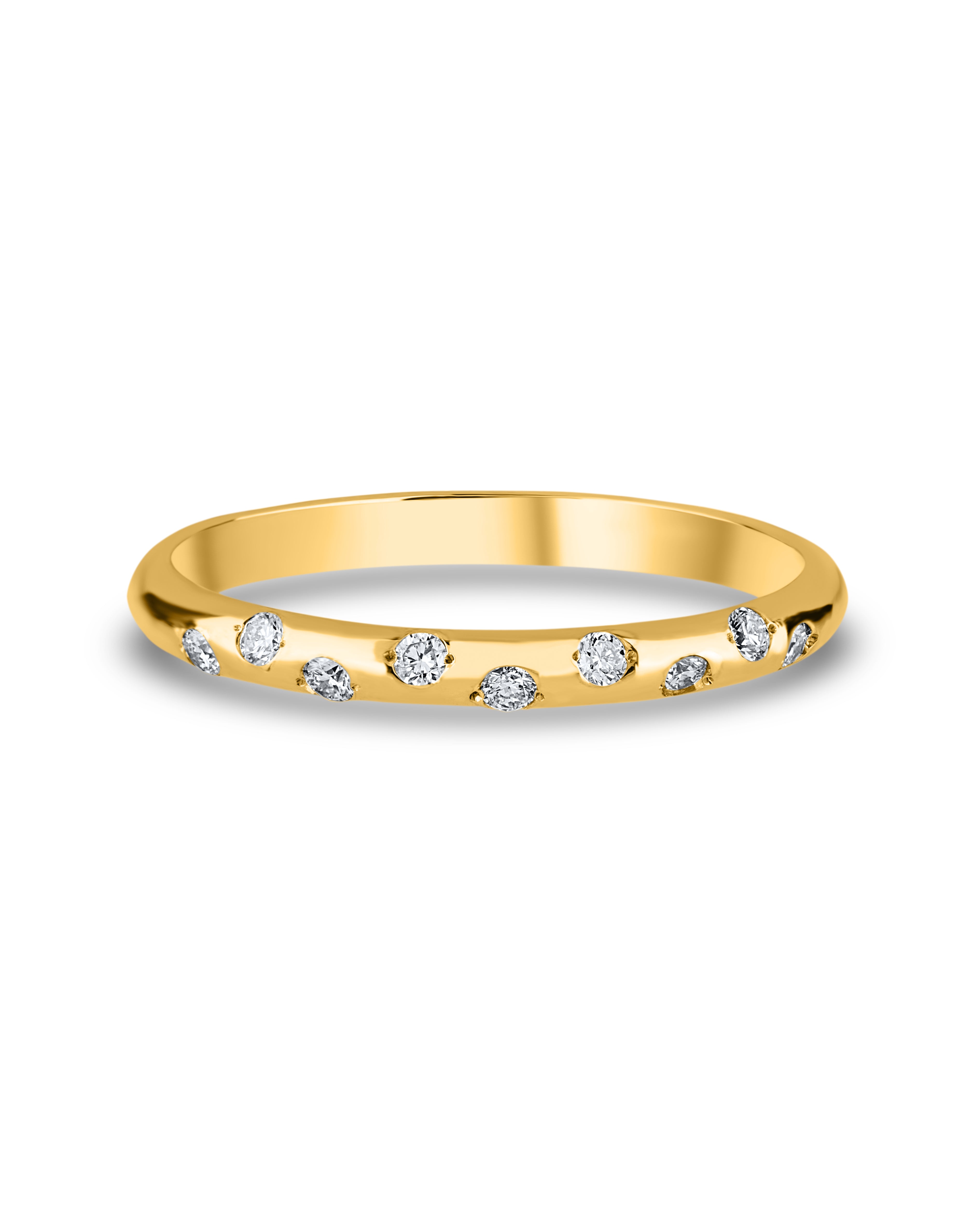 The "Celeste Dots" ring is a graceful tribute to starlit skies and timeless beauty. Crafted in lustrous gold, it features scattered round diamonds delicately set along the smooth band, mimicking stars sprinkled across a golden horizon. Elegant and understated, this ring is perfect for those who appreciate refined sparkle and subtle symbolism. Whether worn alone or as part of a stack, "Celeste Dots" brings a celestial charm to everyday elegance.