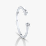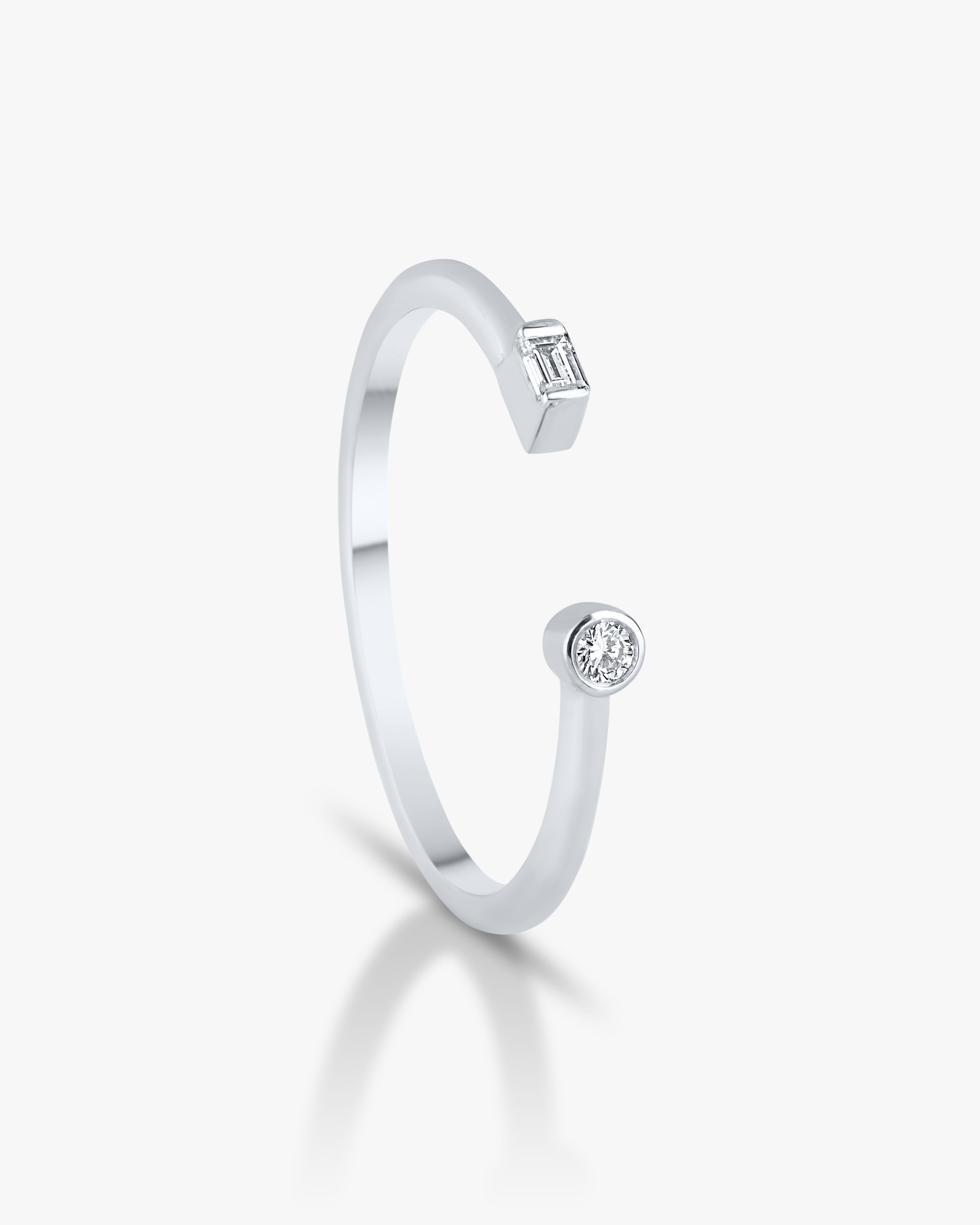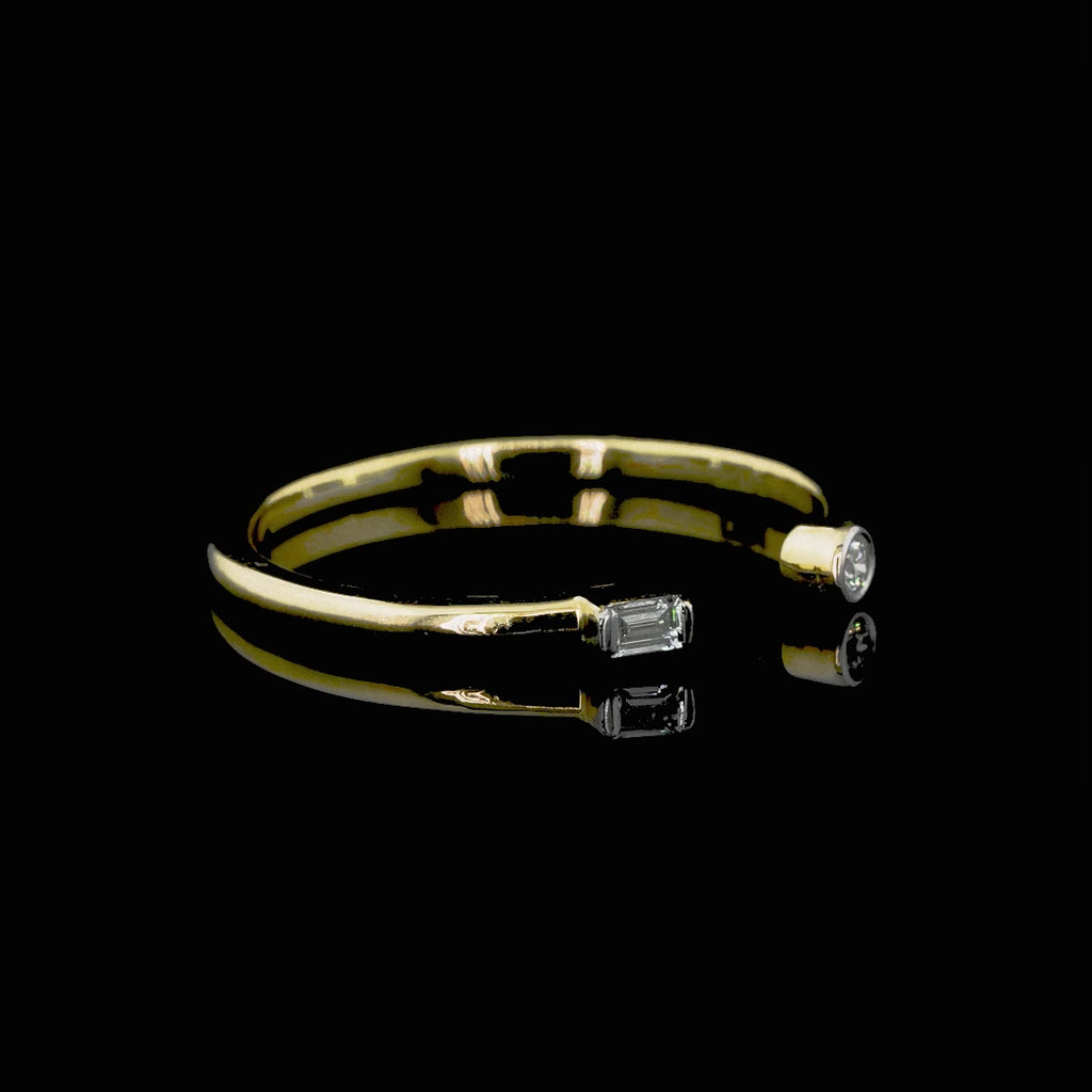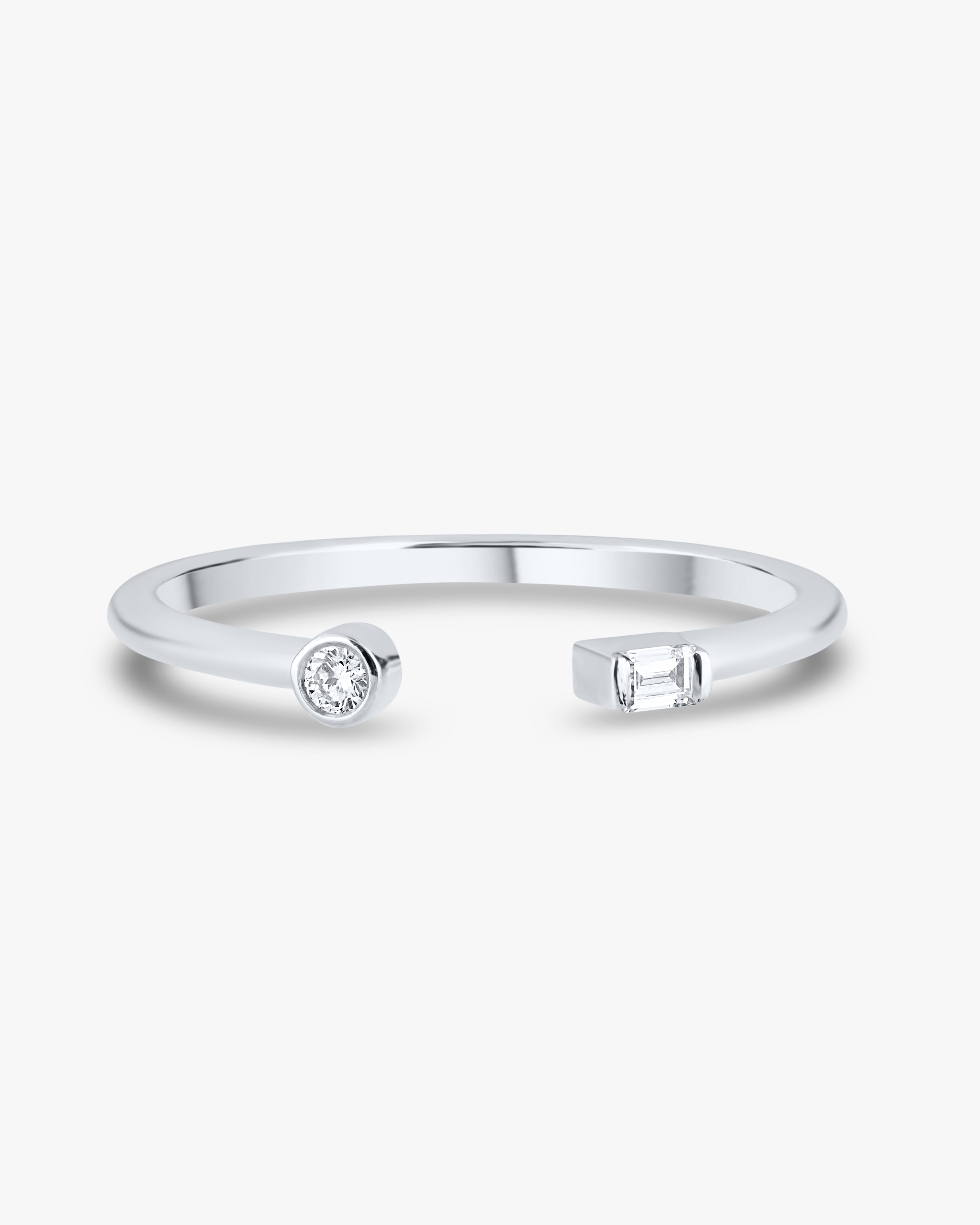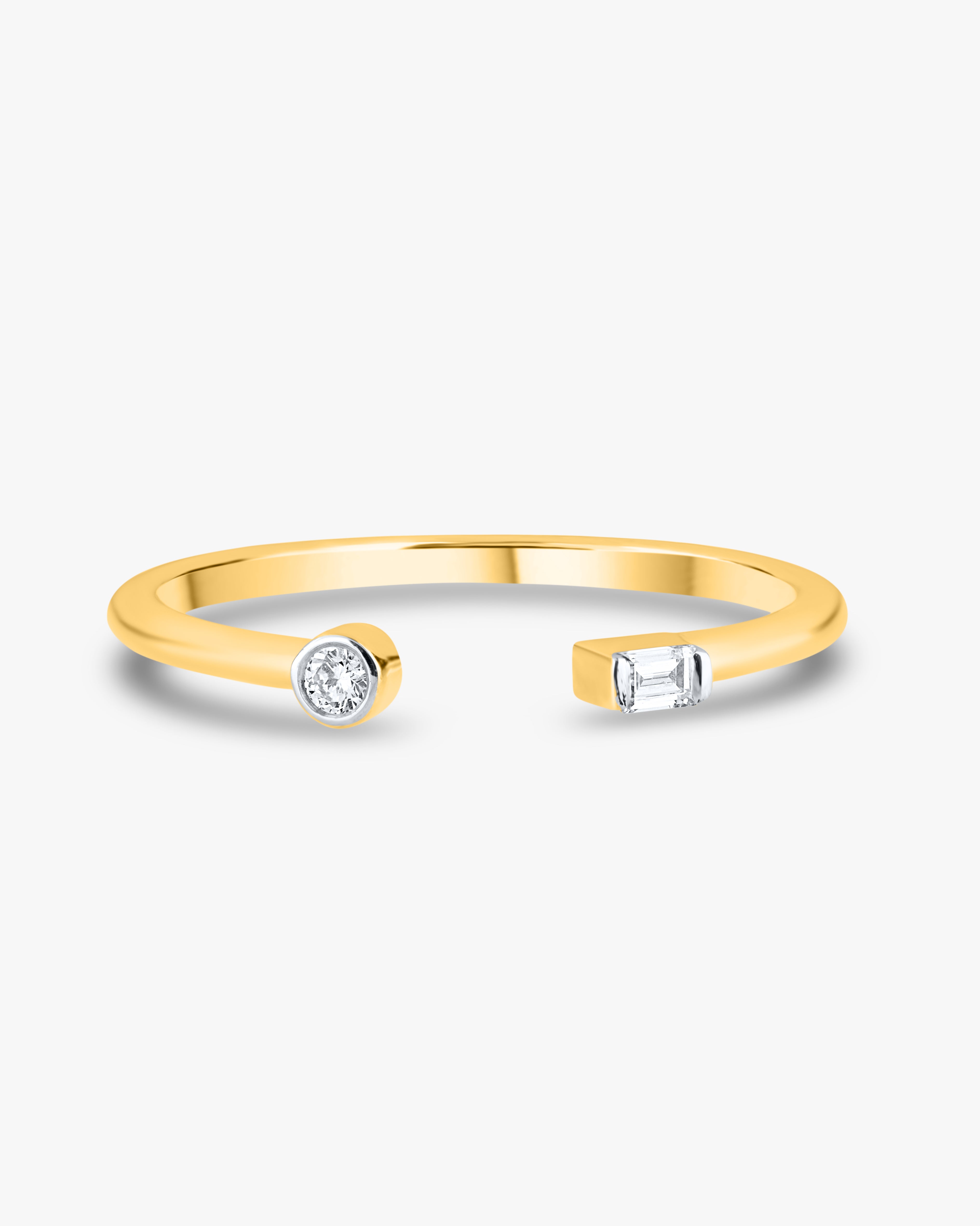 A contemporary open ring crafted in gold, featuring a baguette-cut diamond on one end and a round diamond on the other. The contrast in shapes adds a stylish geometric touch, making it a perfect minimalist statement piece.