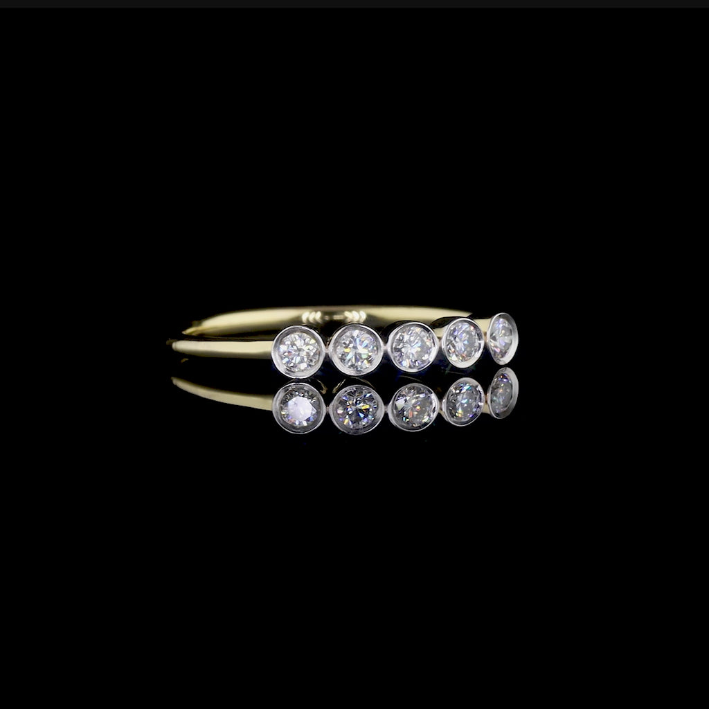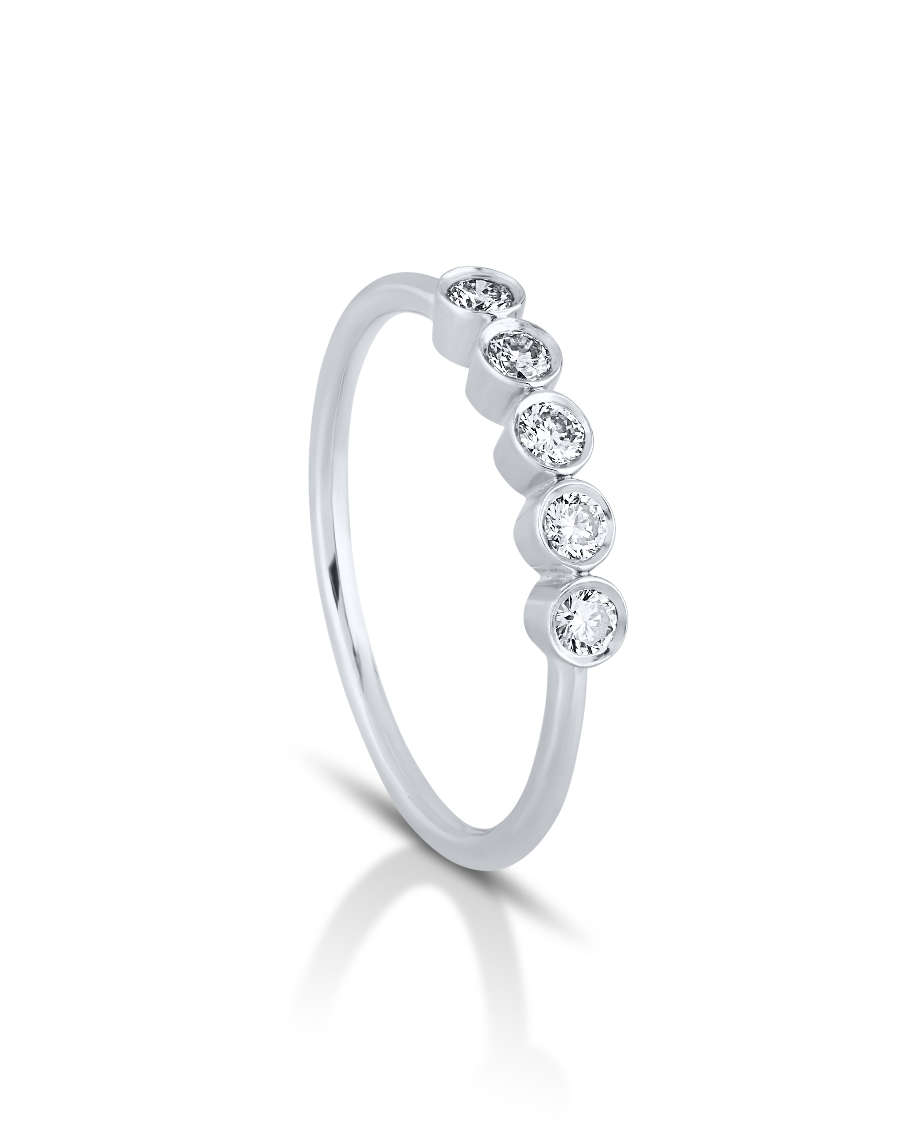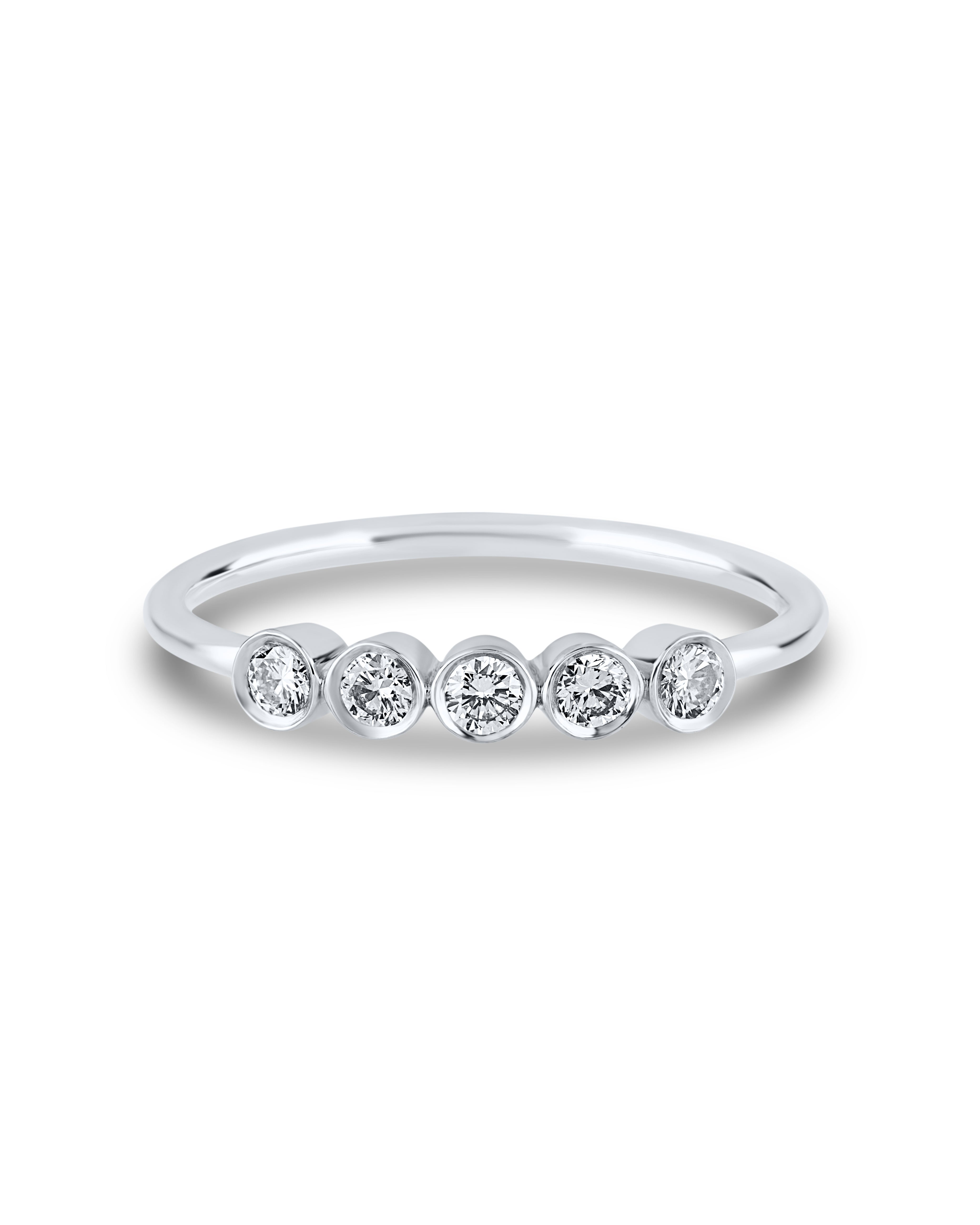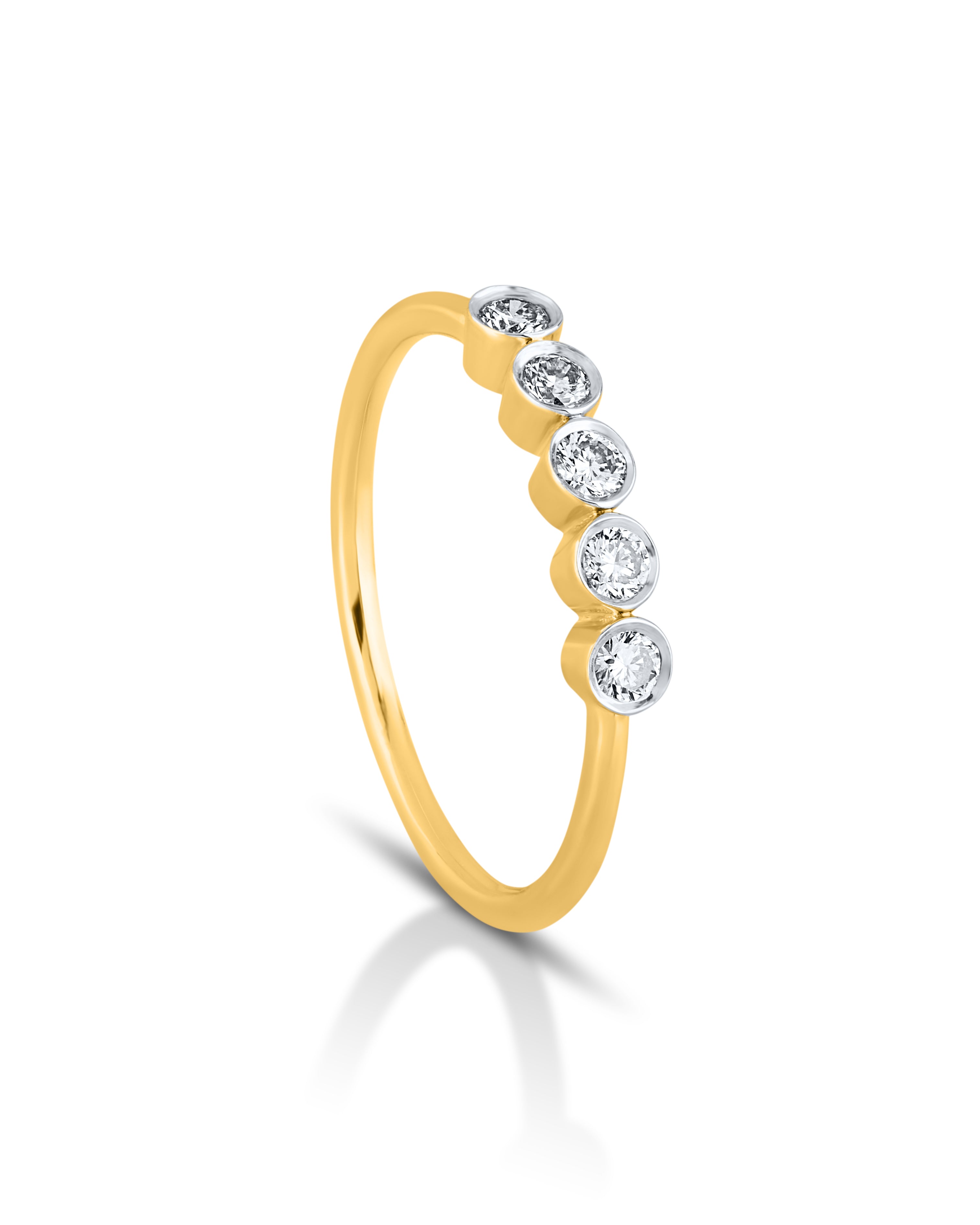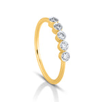 The "Golden Dots" ring is a sleek fusion of modern style and timeless elegance. Crafted in polished gold, it features five bezel-set round diamonds in a neat row, each symbolizing a special moment or milestone. The clean, minimal setting enhances the brilliance of each stone, making this ring perfect for daily wear or meaningful gifting. Whether worn solo or stacked, "Golden Dots" adds a refined sparkle and contemporary charm to any look.
