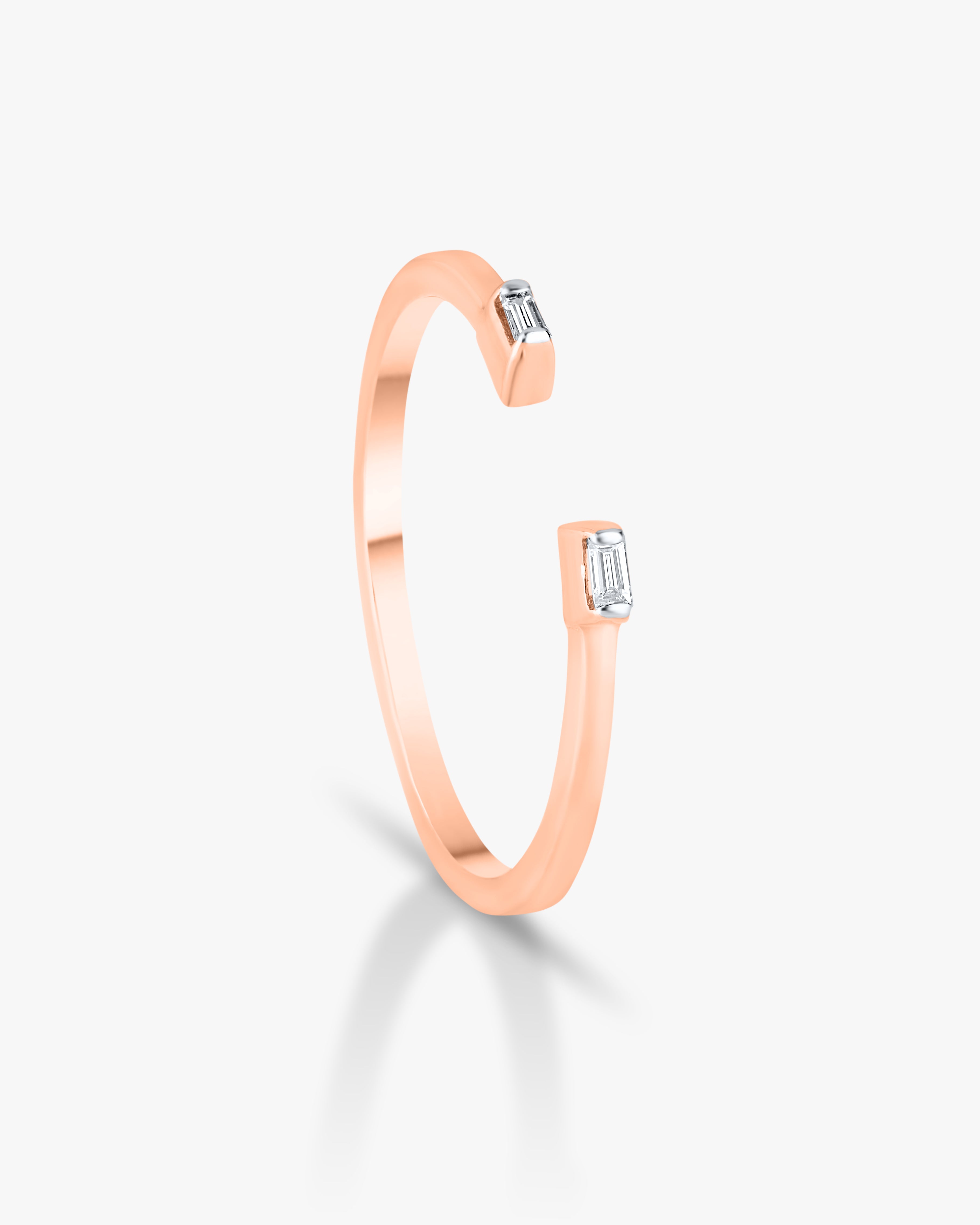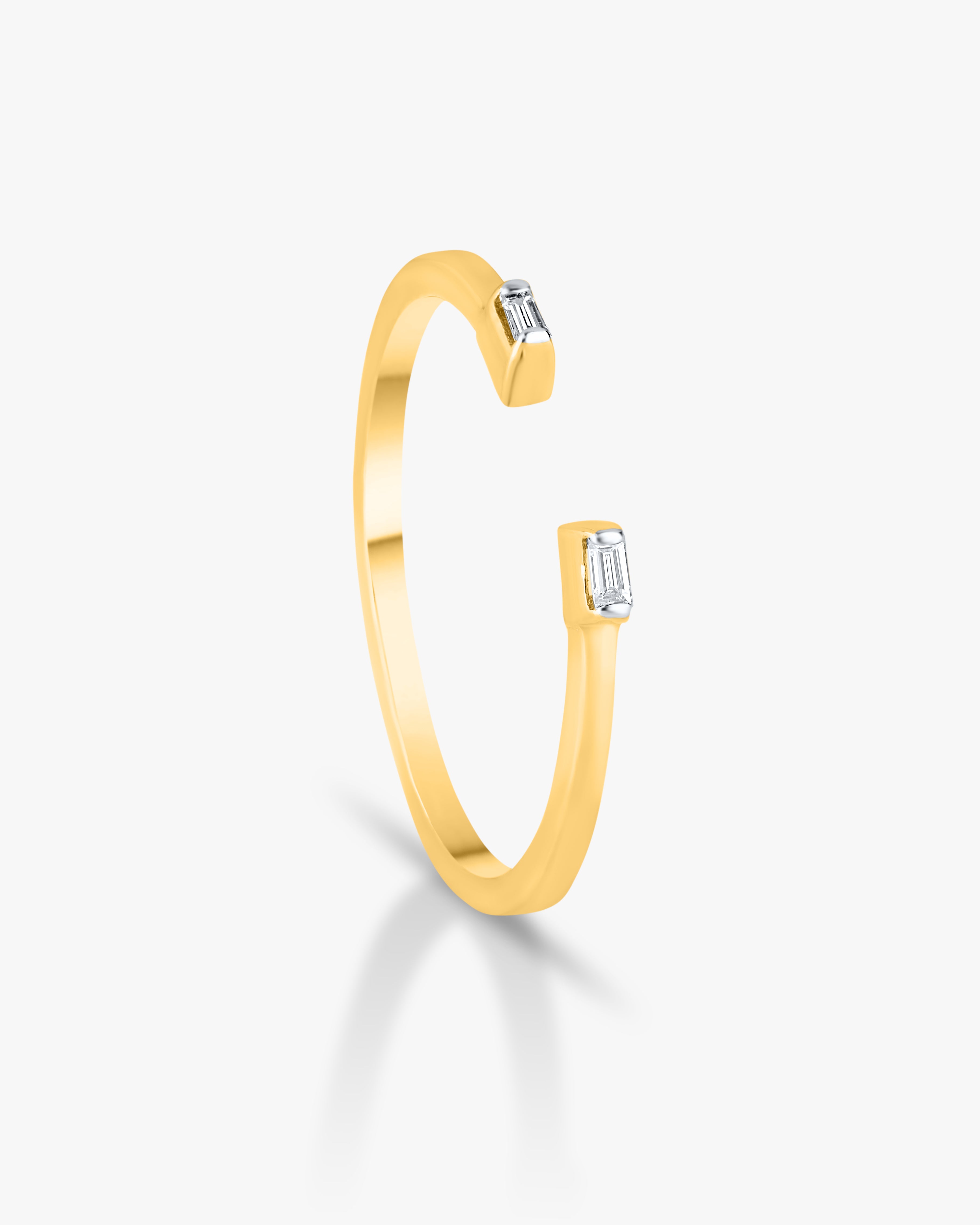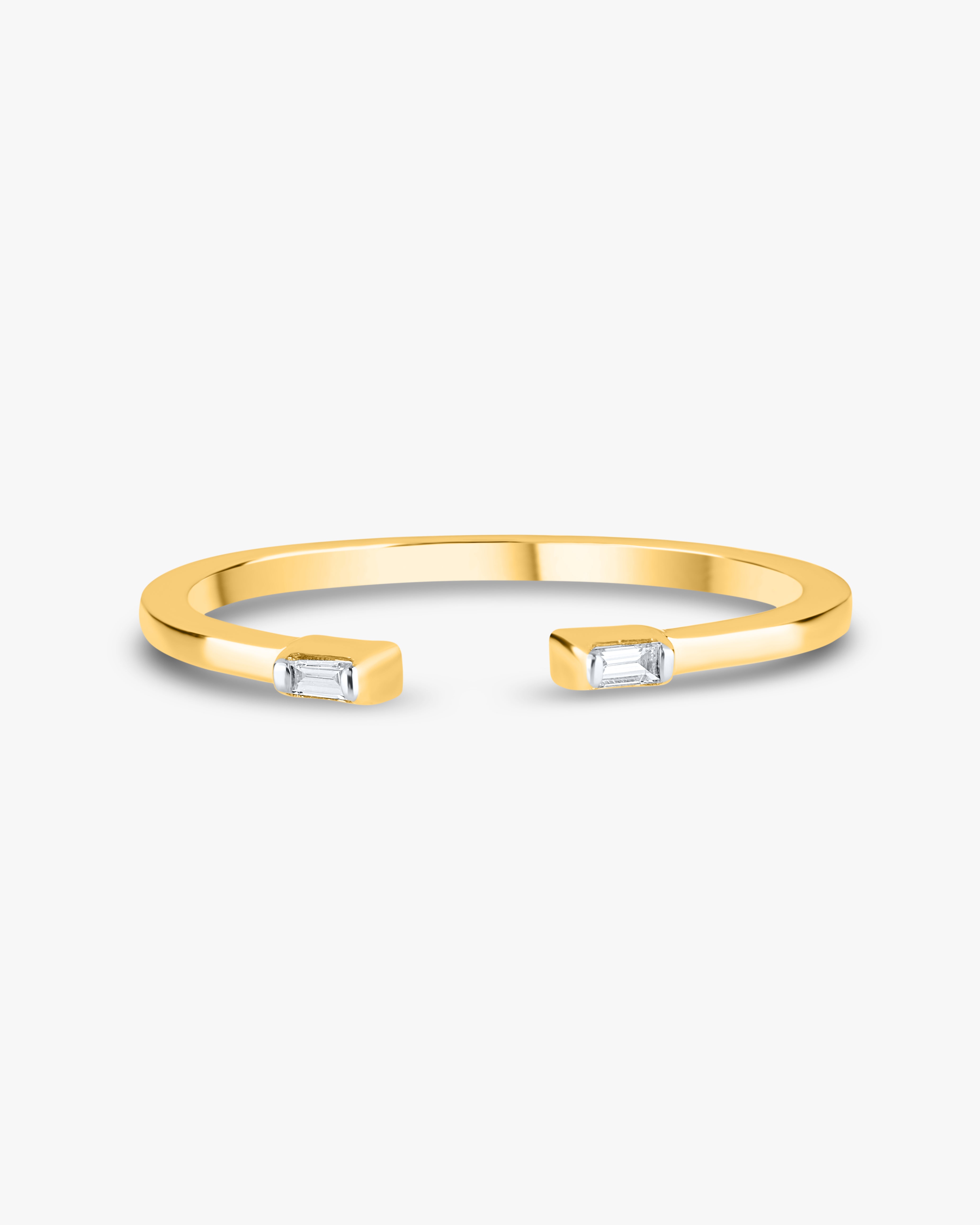 A sleek open gold band featuring two baguette-cut diamonds on each end. Clean lines and minimalist charm give this ring a contemporary edge perfect for everyday elegance or stacking with other rings.