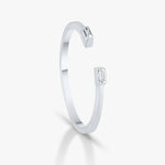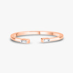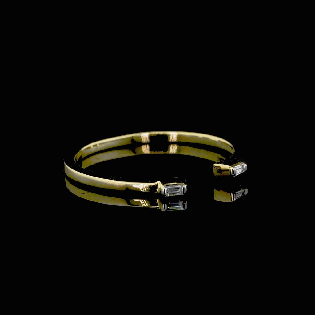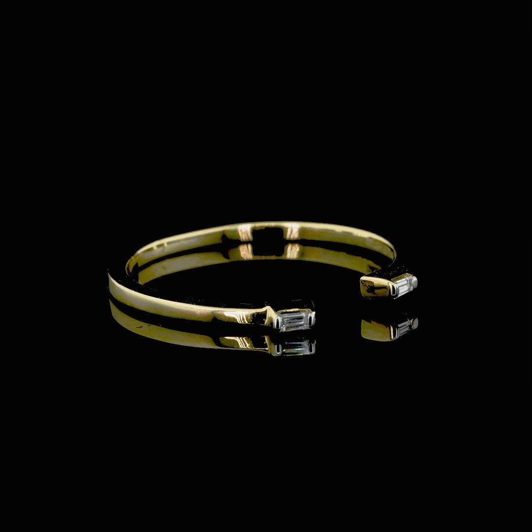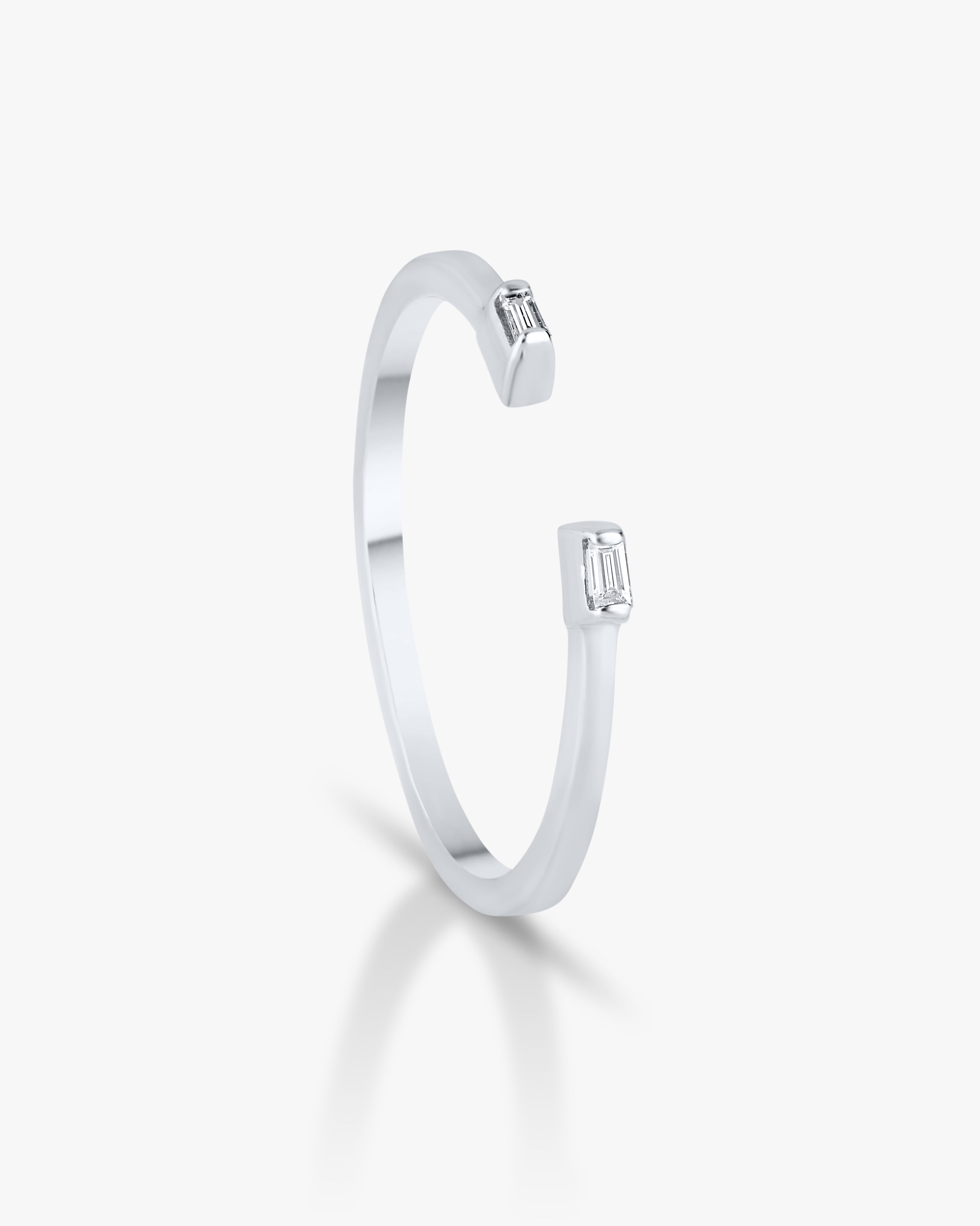 A sleek open gold band featuring two baguette-cut diamonds on each end. Clean lines and minimalist charm give this ring a contemporary edge perfect for everyday elegance or stacking with other rings.