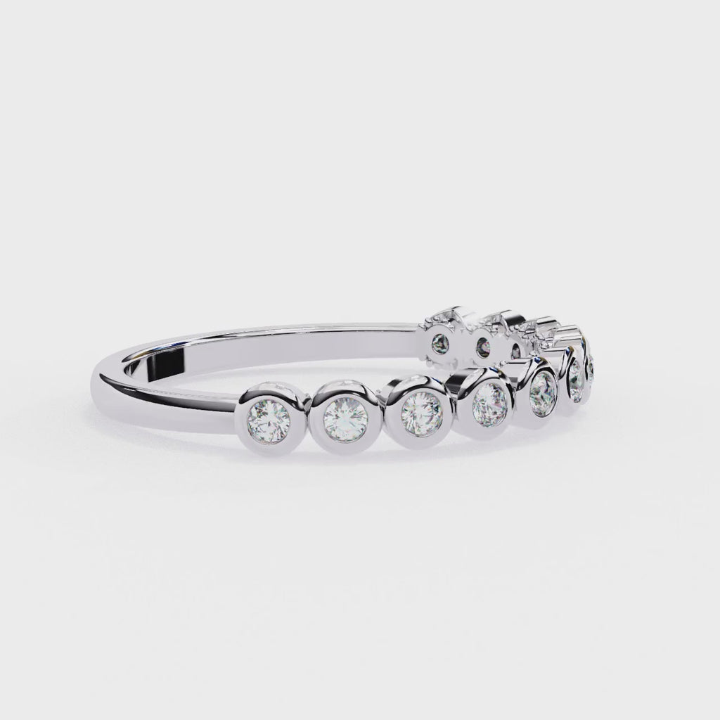 This gold ring features a delicate design with a series of small round diamonds set along one side of the band. The diamonds appear to be bezel-set, giving the ring a modern and sleek look. The band is slim and polished, enhancing the brilliance of the gold and the sparkle of the diamonds.