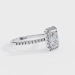 This is gold engagement ring featuring a rectangular radiant cut center diamond. The center stone is surrounded by a halo of smaller diamonds, and the band is also adorned with pavé-set diamonds.