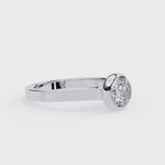 This is a beautiful ring featuring a large, round cut diamond set in a rose gold band with a bezel setting. The design is modern and elegant, with the bezel setting giving the diamond a secure and sleek appearance.