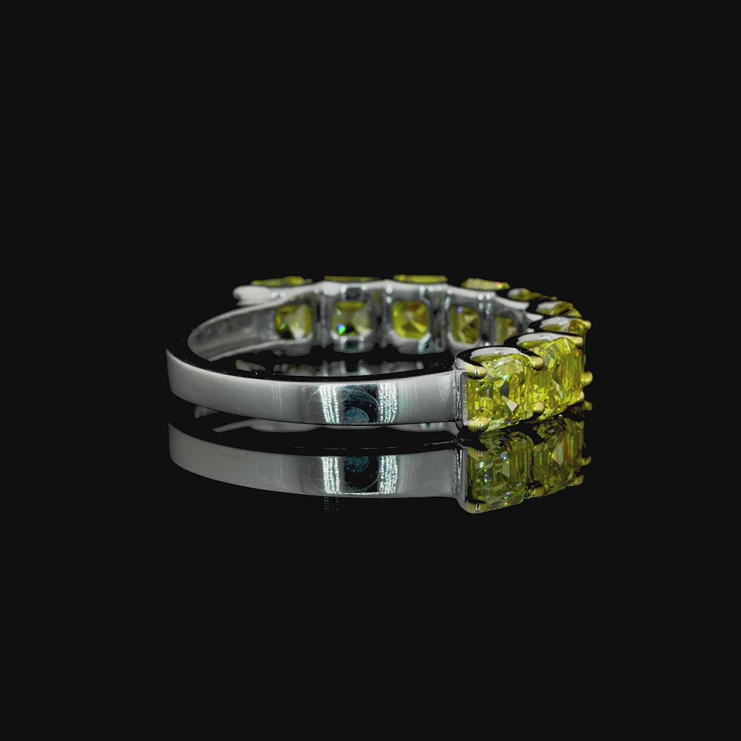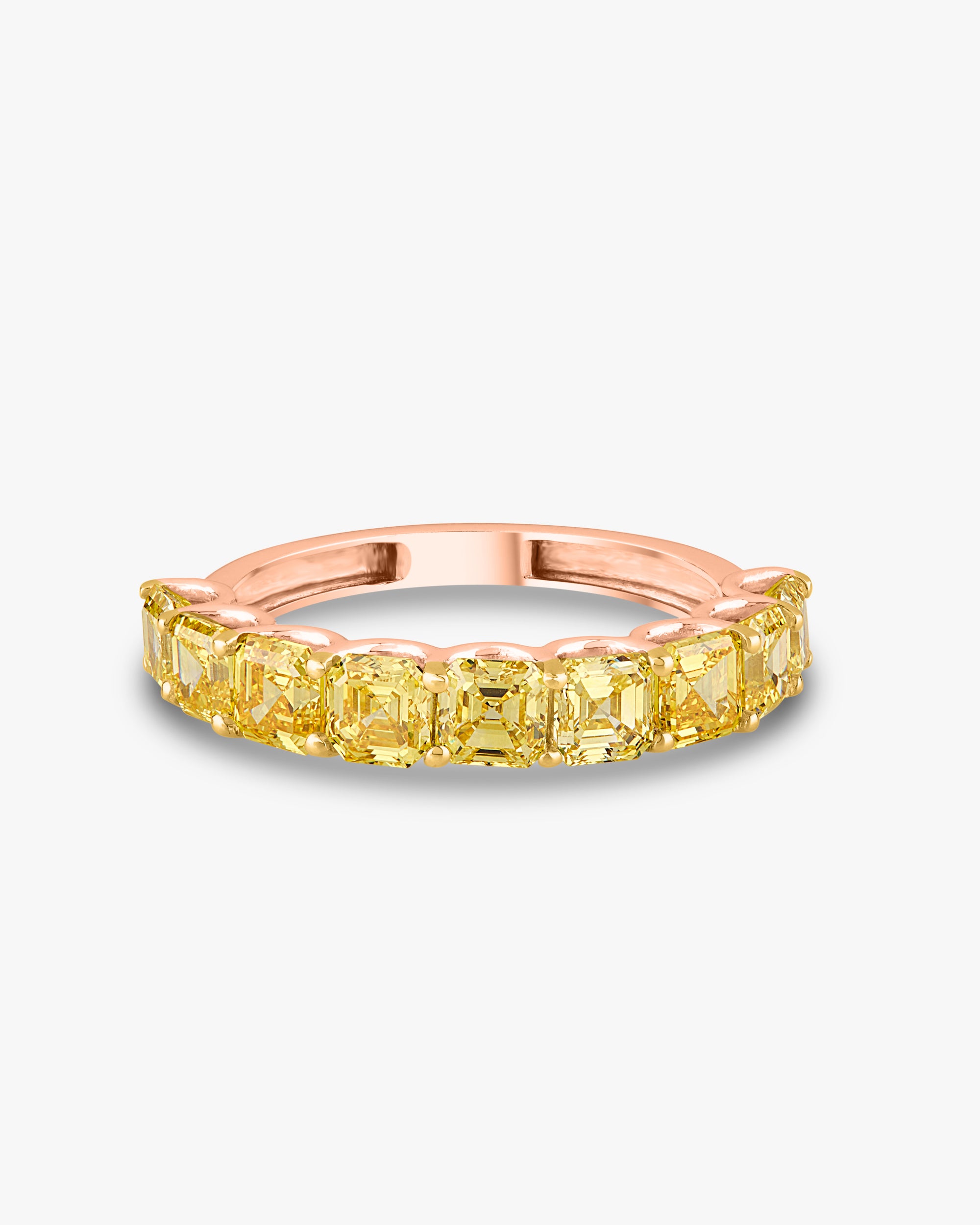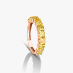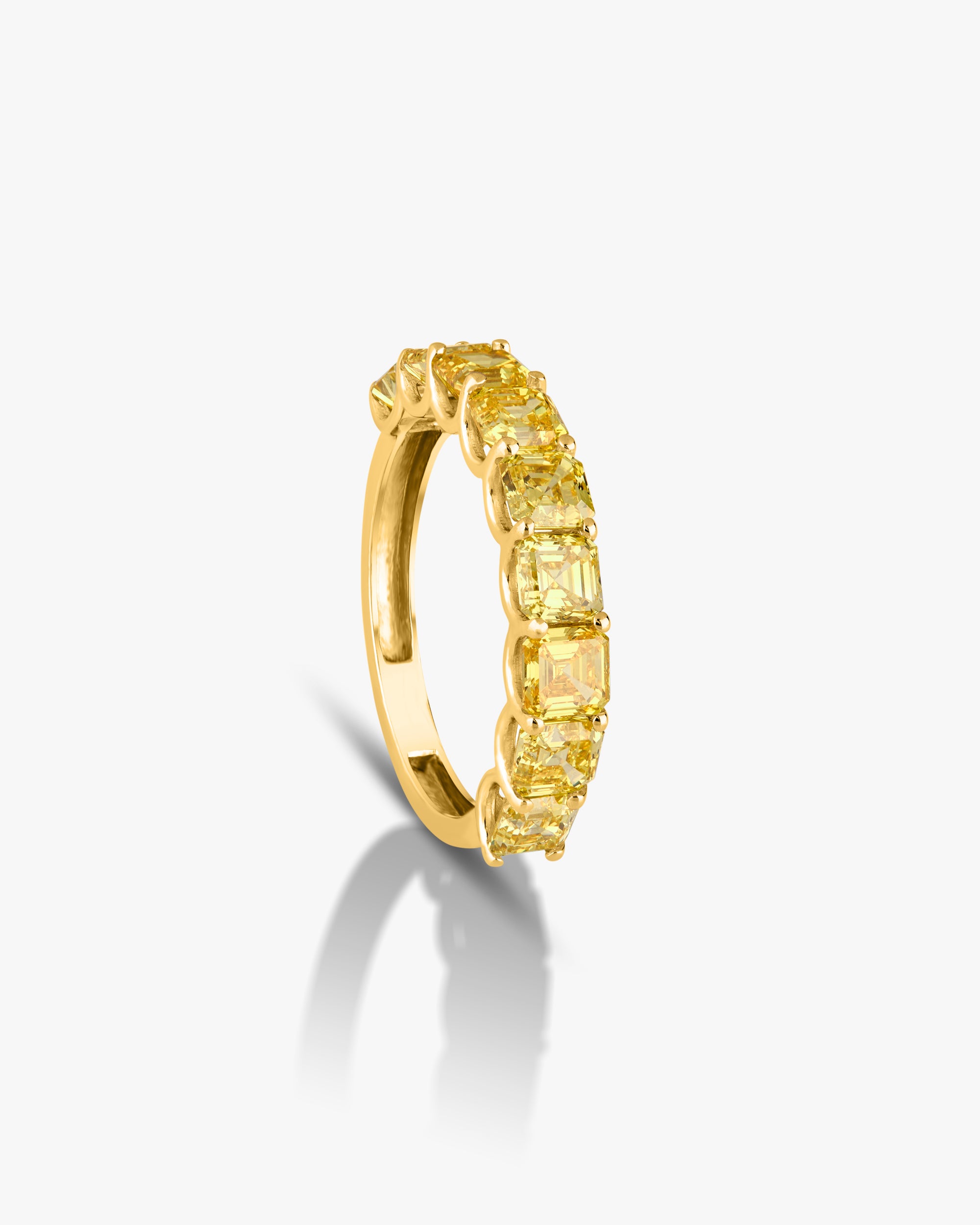 The three rings you've shared each represent distinct styles, purposes, and aesthetics, making them suitable for different occasions and personalities. The first ring features a classic half-eternity design, showcasing a sleek row of square yellow gemstones set in a polished white gold band.