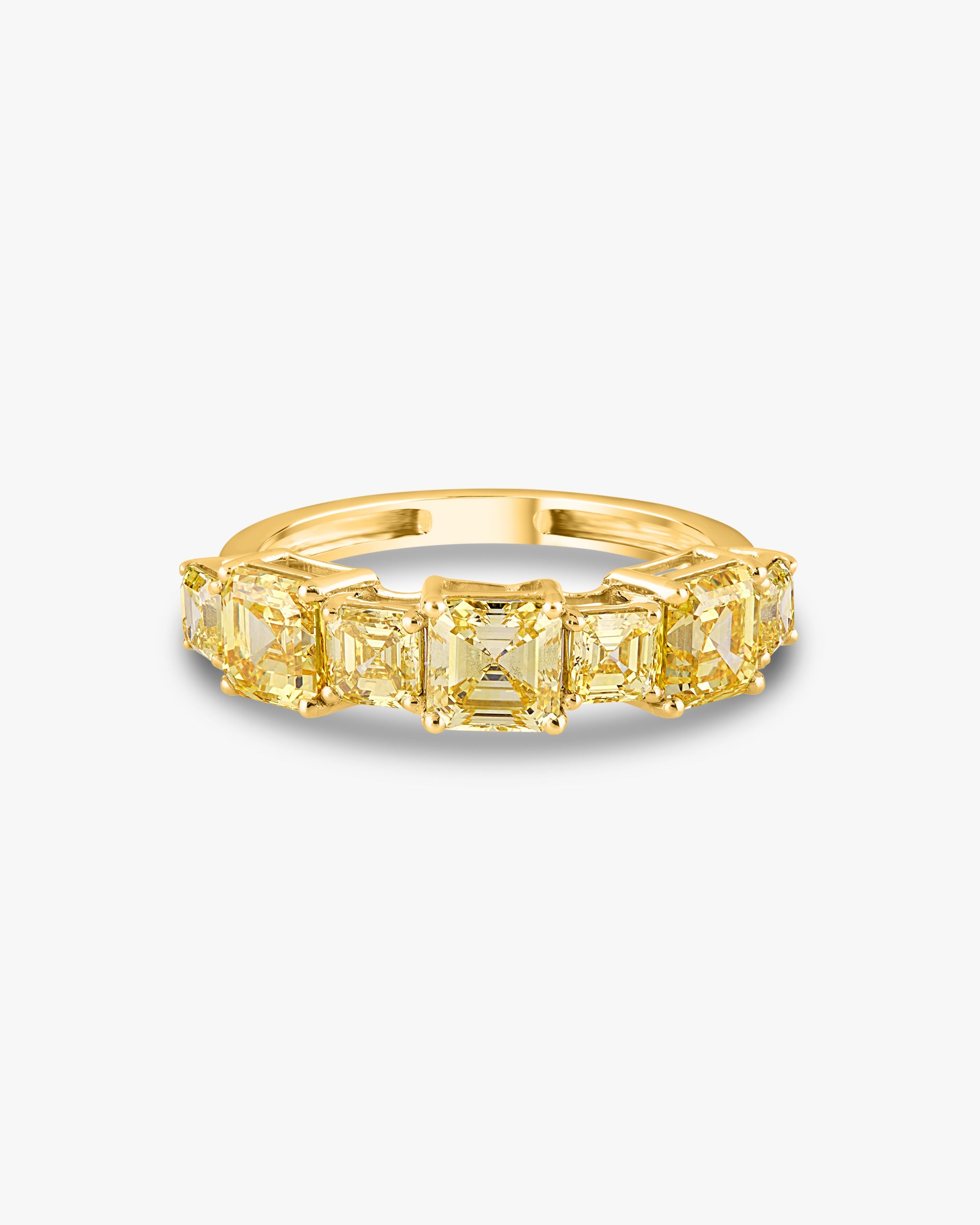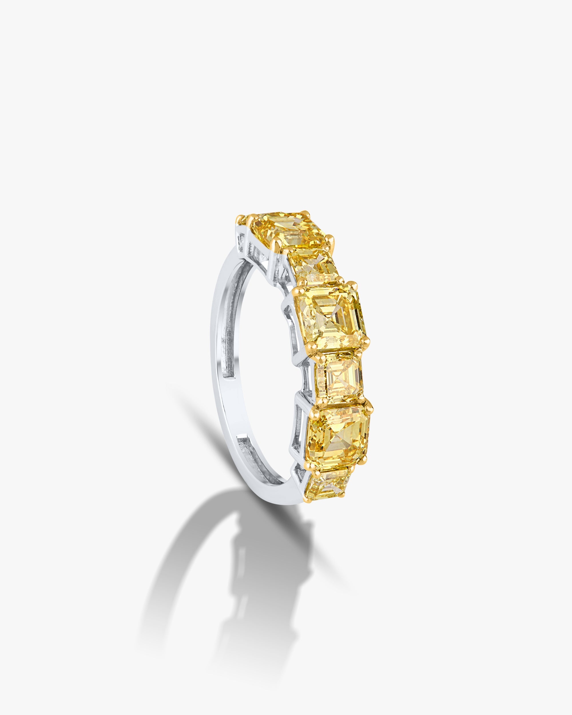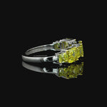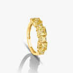 You've re-uploaded the bold multi-stone yellow gemstone ring. This design features several large yellow stones likely radiant or cushion cut set in an eye-catching claw-prong setting. The prongs are quite prominent, giving the ring a dramatic, high-profile appearance. The band, made of polished white metal, adds contrast and enhances the vibrancy of the yellow stones.